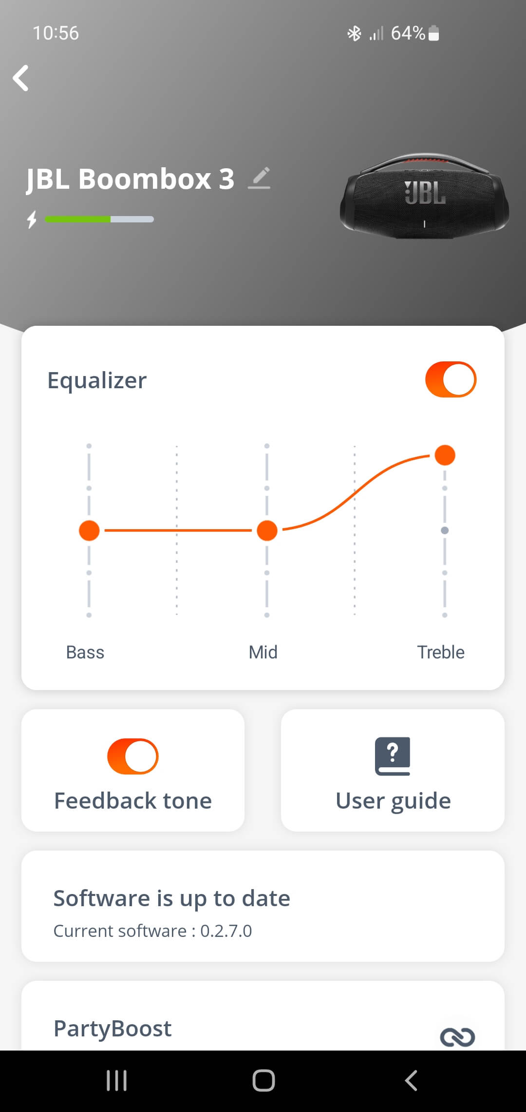 Ogólnie rzecz biorąc, dźwięk głośnika ma dość dominujący i przenikliwy bas, co działa na jego korzyść w przypadku używania w większych pomieszczeniach. W porównaniu do poprzednich generacji, wysokie i średnie tony są nieco jaśniejsze w trybie domyślnym. W aplikacji JBL Portable znajdziesz korektor, który pozwala dostosować intensywność trzech podstawowych częstotliwości (basy, średnie i wysokie tony).