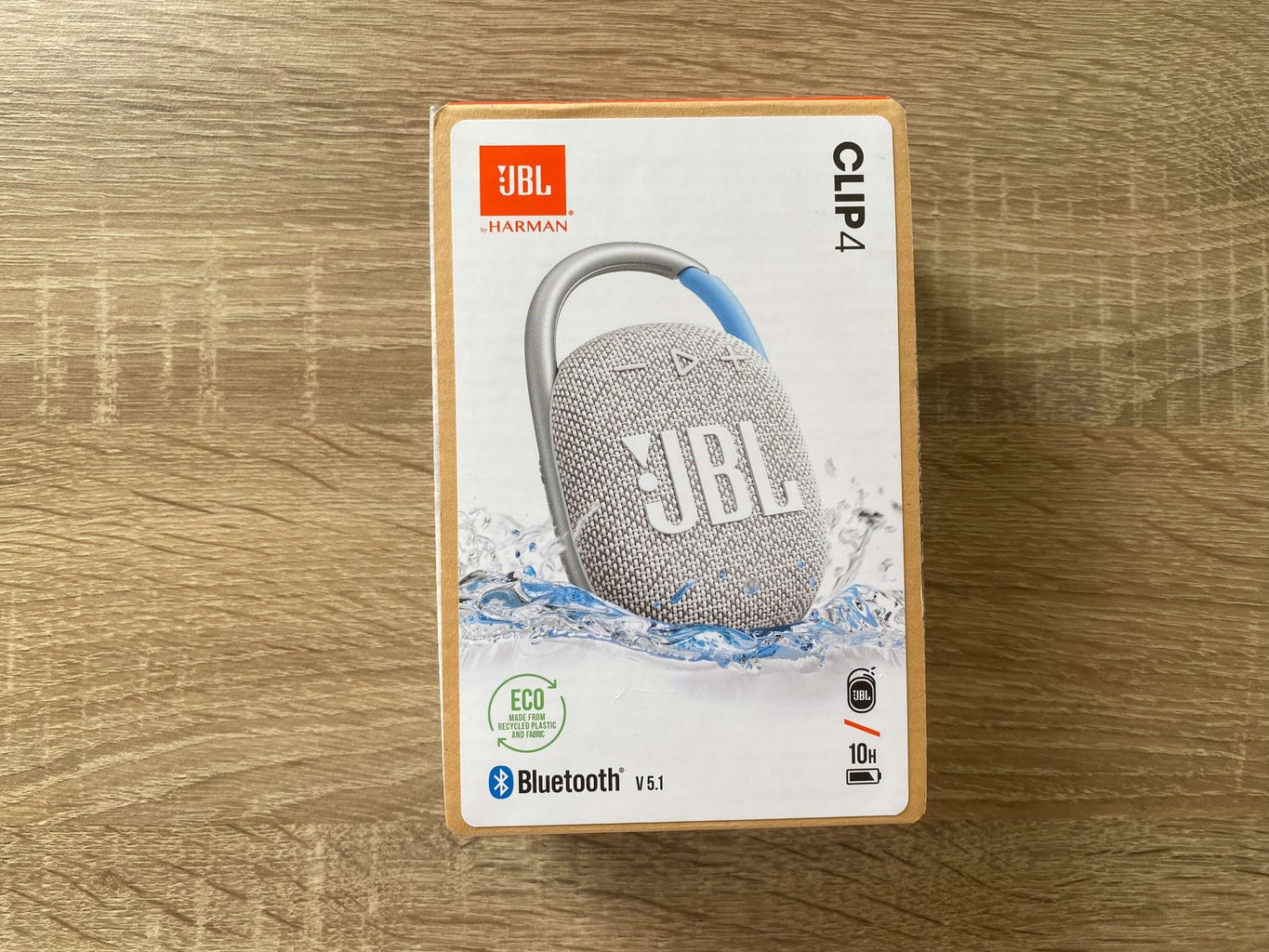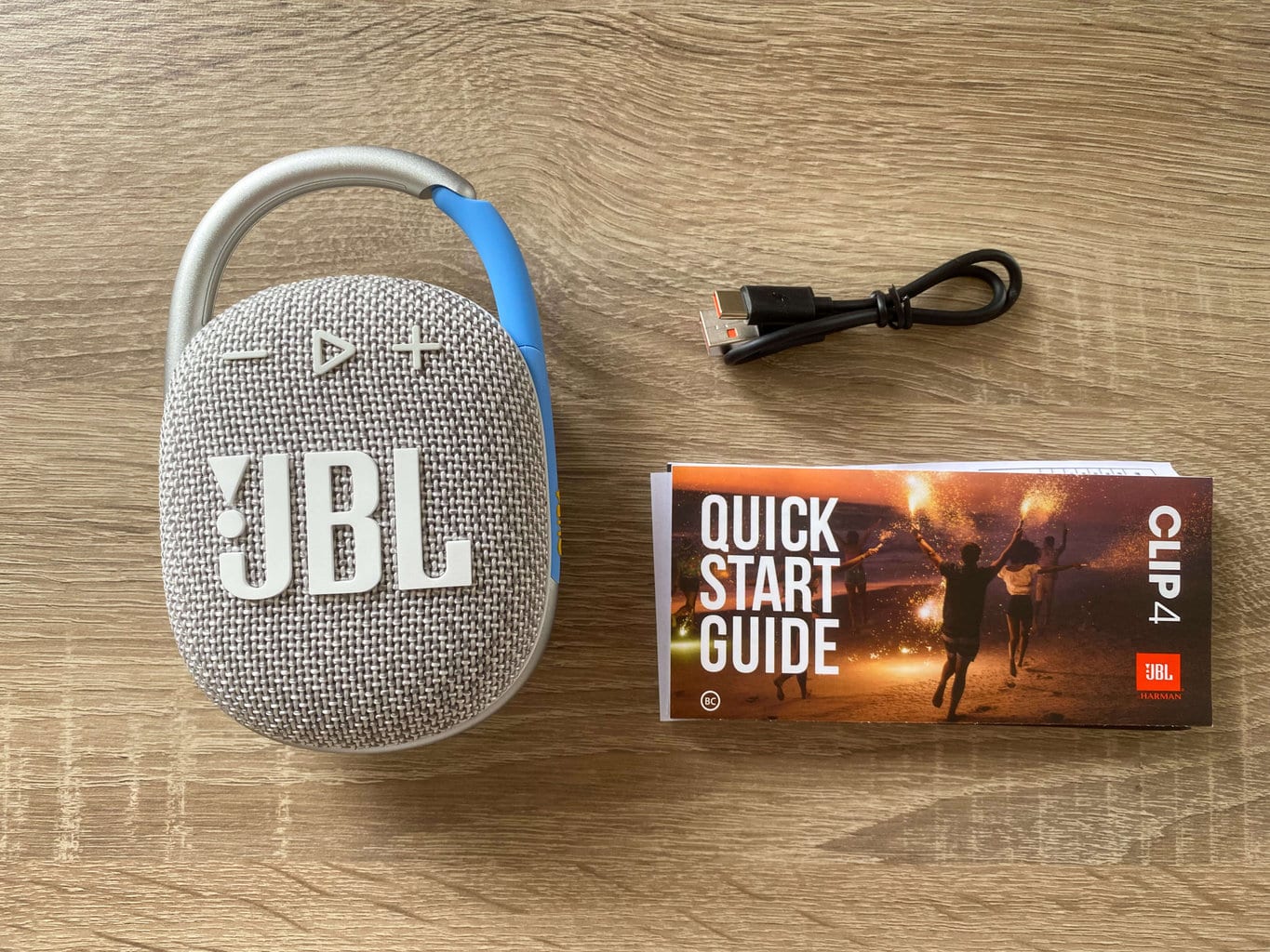 Głośnik Bluetooth JBL Clip 4 jest sprzedawany w małym pudełku o wymiarach 14,5 × 10 × 6 cm i łącznej wadze 360 gramów. Po wyjęciu z pudełka można zobaczyć: