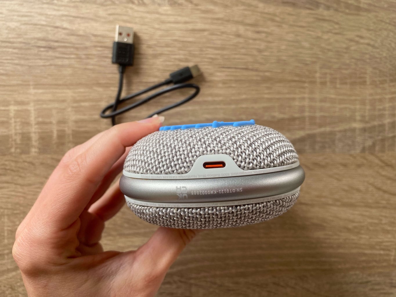 W górnej części głośnika znajduje się dioda LED. Jeśli miga, ostrzega o niskim poziomie naładowania baterii i konieczności naładowania. Jeśli głośnik jest w trakcie ładowania, dioda LED będzie świecić na czerwono. Pełne naładowanie zajmuje około 3 godzin, niestety funkcja szybkiego ładowania nie jest obsługiwana przez urządzenie.