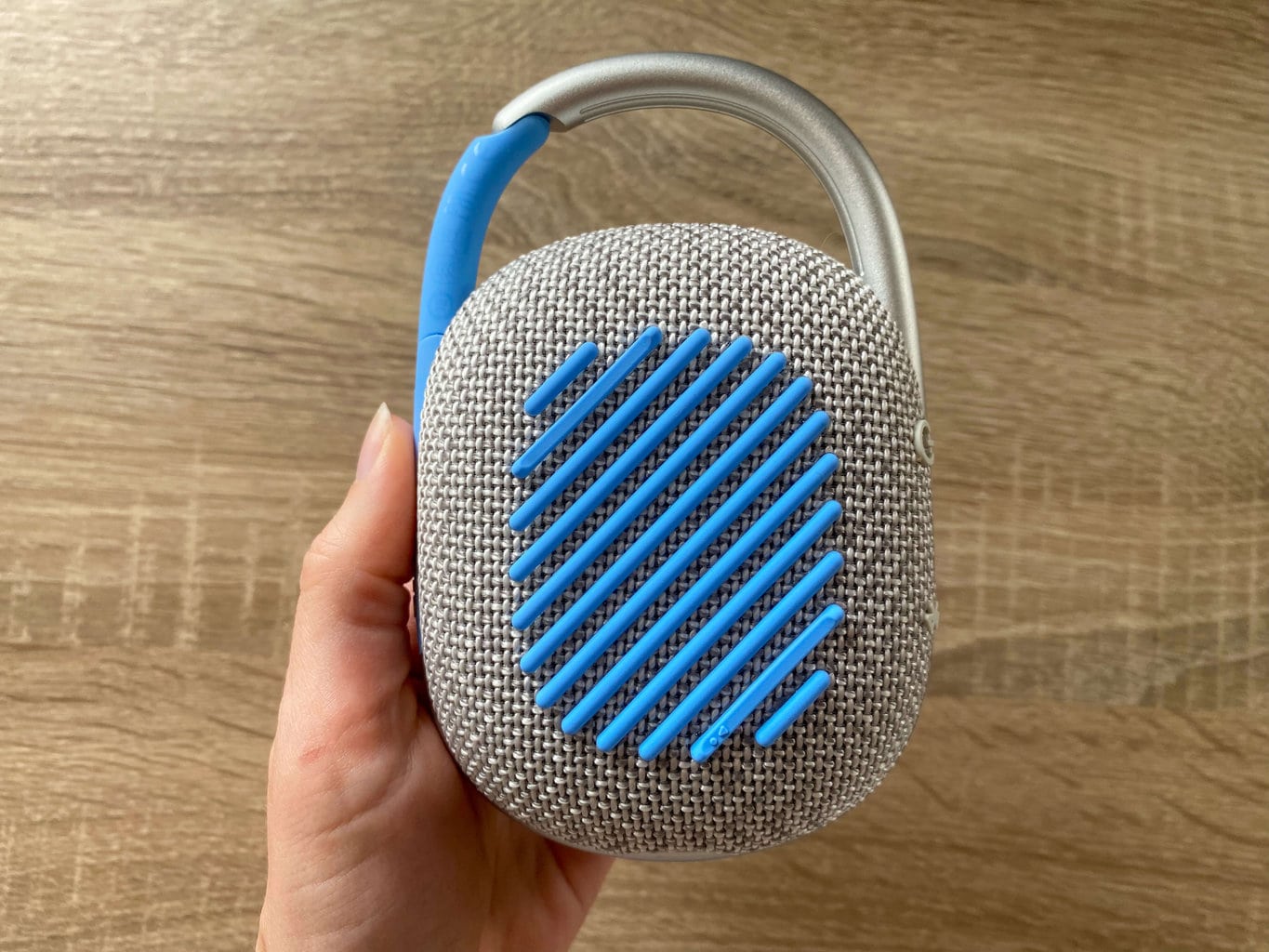 Pod względem jakości wykonania głośnikowi nie można nic zarzucić. Jego korpus pokryty jest tradycyjną tkaniną z tworzywa sztucznego, a wokół głośnika znajduje się aluminiowa rama, która płynnie przechodzi we wspomniany wcześniej karabińczyk. Jest on łatwy do otwarcia jednym palcem i nie wymaga użycia dużej siły. Niestety, skądinąd interesujący karabińczyk nie sprawił na nas najbardziej solidnego wrażenia. Nie mieliśmy z nim żadnych problemów podczas testów, ale subiektywnie postrzegamy go jako możliwą słabość przy dłuższym korzystaniu z głośnika. Kolejnym małym niedociągnięciem jest to, że złącze ładowania na dole nie jest niczym chronione.