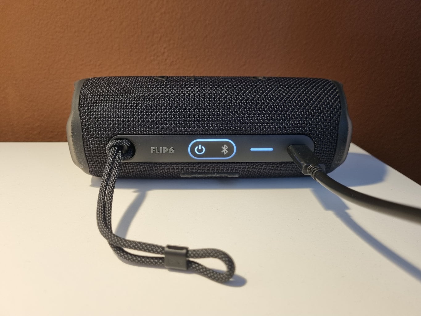 Do ładowania głośnika służy dołączony kabel zasilający ze złączem USB-A/USB-C. Niefortunnie umieszczona dioda LED na spodzie głośnika ostrzega o potrzebie ładowania. Alternatywnie informacje te można znaleźć w aplikacji JBL Portable.