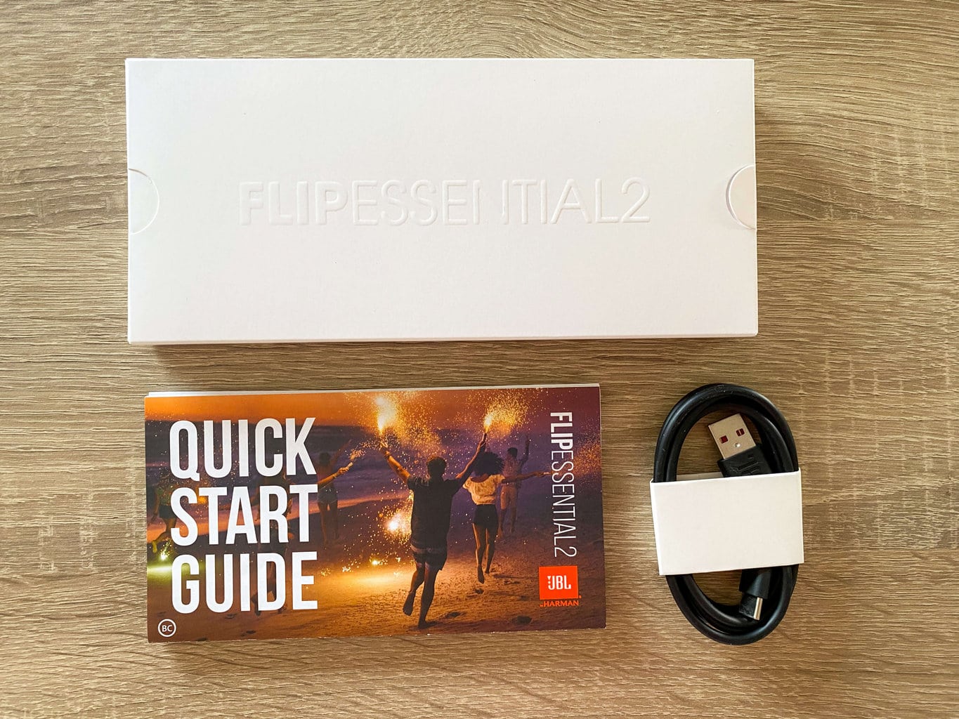 Głośnik Bluetooth JBL Flip Essential 2 dotarł do naszej redakcji w designerskim pudełku o wymiarach 21 × 10 × 11 cm i wadze 894 gramów. Po jego otwarciu naszym oczom ukazał się nie tylko głośnik, ale również kabel zasilający i instrukcja obsługi.