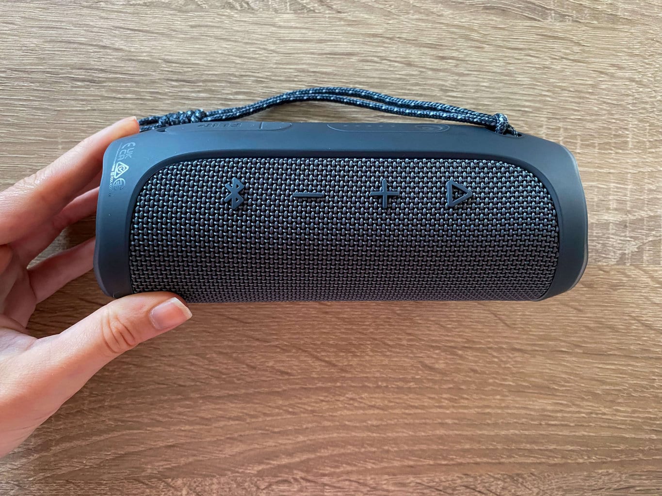 Głośnik charakteryzuje się wysoką jakością wykonania i pod tym względem nie można mu praktycznie nic zarzucić. Jego obudowa pokryta jest wytrzymałą tkaniną. Przyciski są lekko uniesione, dzięki czemu łatwo je wyczuć bez konieczności dokładnego przyglądania się głośnikowi. Przydatną funkcją jest również pętla do zawieszania głośnika. Pozwala to zawiesić urządzenie na haku lub gałęzi drzewa podczas słuchania na świeżym powietrzu (na przykład na pikniku).