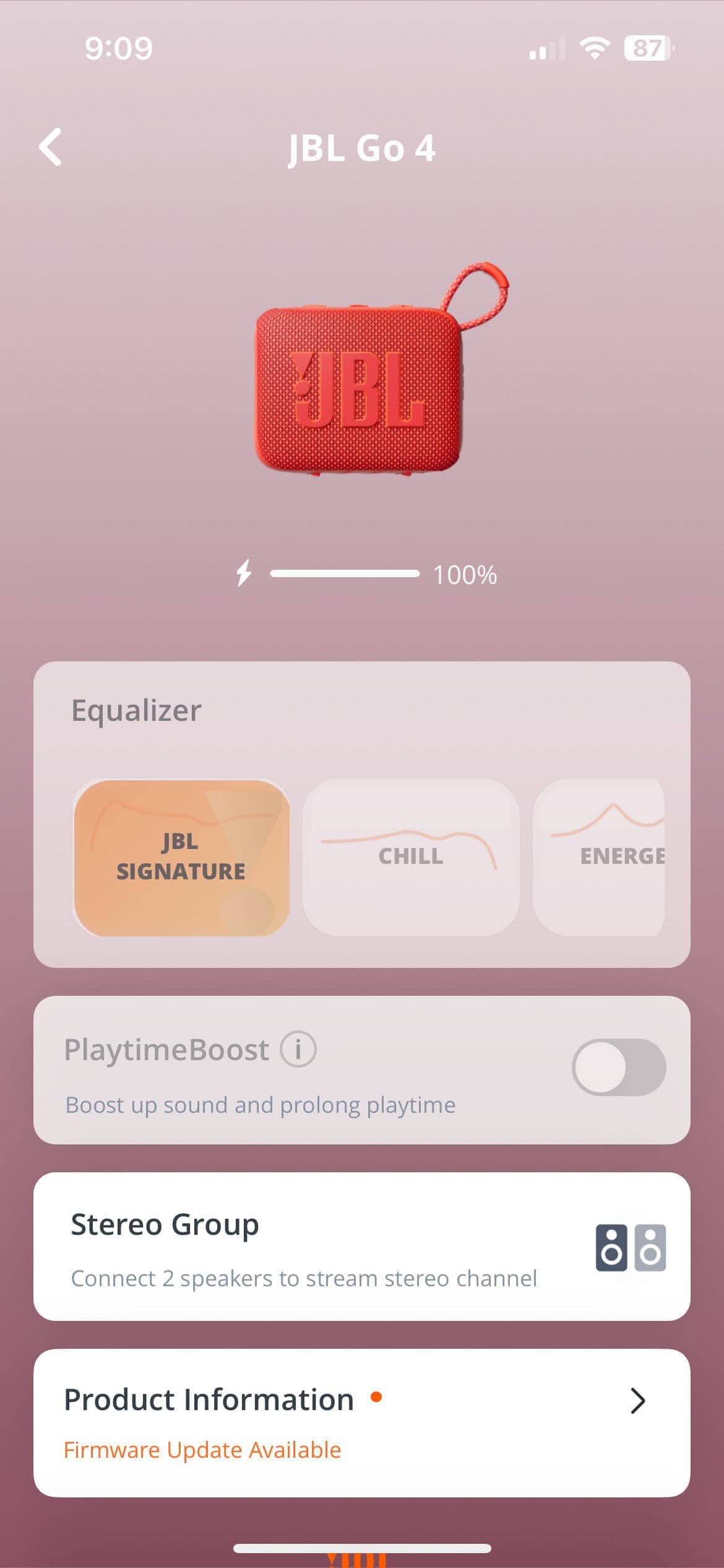 Przede wszystkim umożliwia monitorowanie aktualnego poziomu naładowania głośnika w procentach. Można również skorzystać z sekcji wyboru equalizera. Osobiście podczas słuchania muzyki popularnej najczęściej wybierałam wariant JBL Signature, dzięki któremu uzyskiwałam dobrze zbalansowane brzmienie.