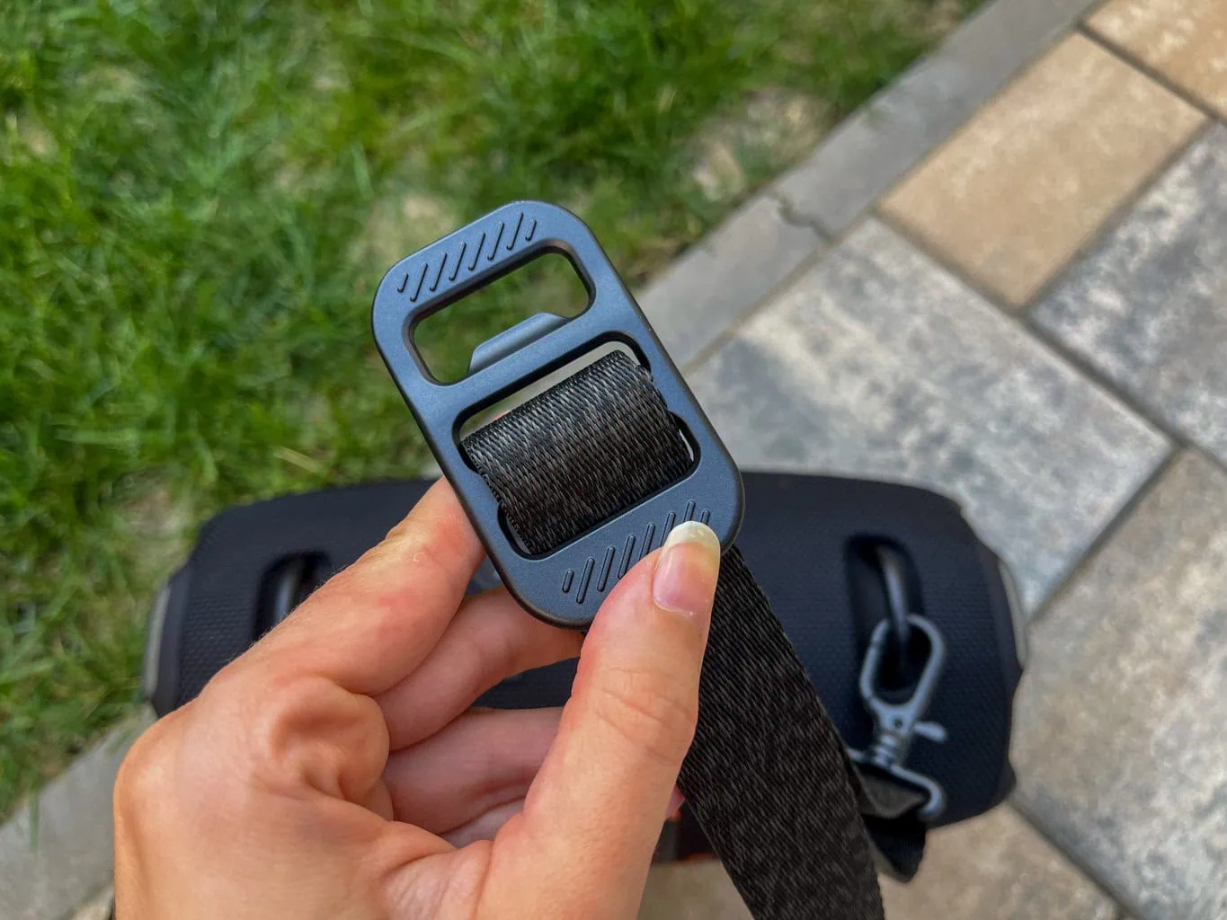 Podobnie jak w przypadku Xtreme 3, głośnik posiada mocne uchwyty do przyczepienia dołączonego paska. Plastikowe klipsy są stosunkowo łatwe do umieszczenia w tych uchwytach. Podobnie jak w przypadku poprzedniej generacji, pasek jest wyposażony w ciekawy detal w postaci otwieracza do butelek, który z pewnością może uprzyjemnić każdą imprezę. Długość paska można oczywiście regulować.