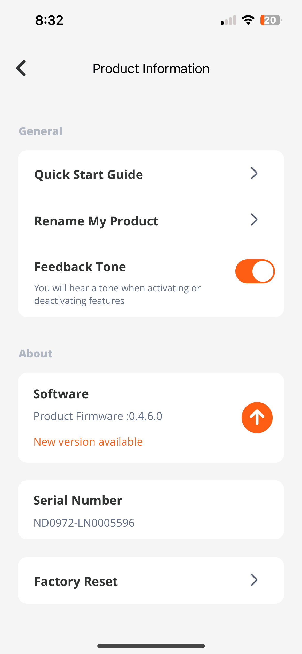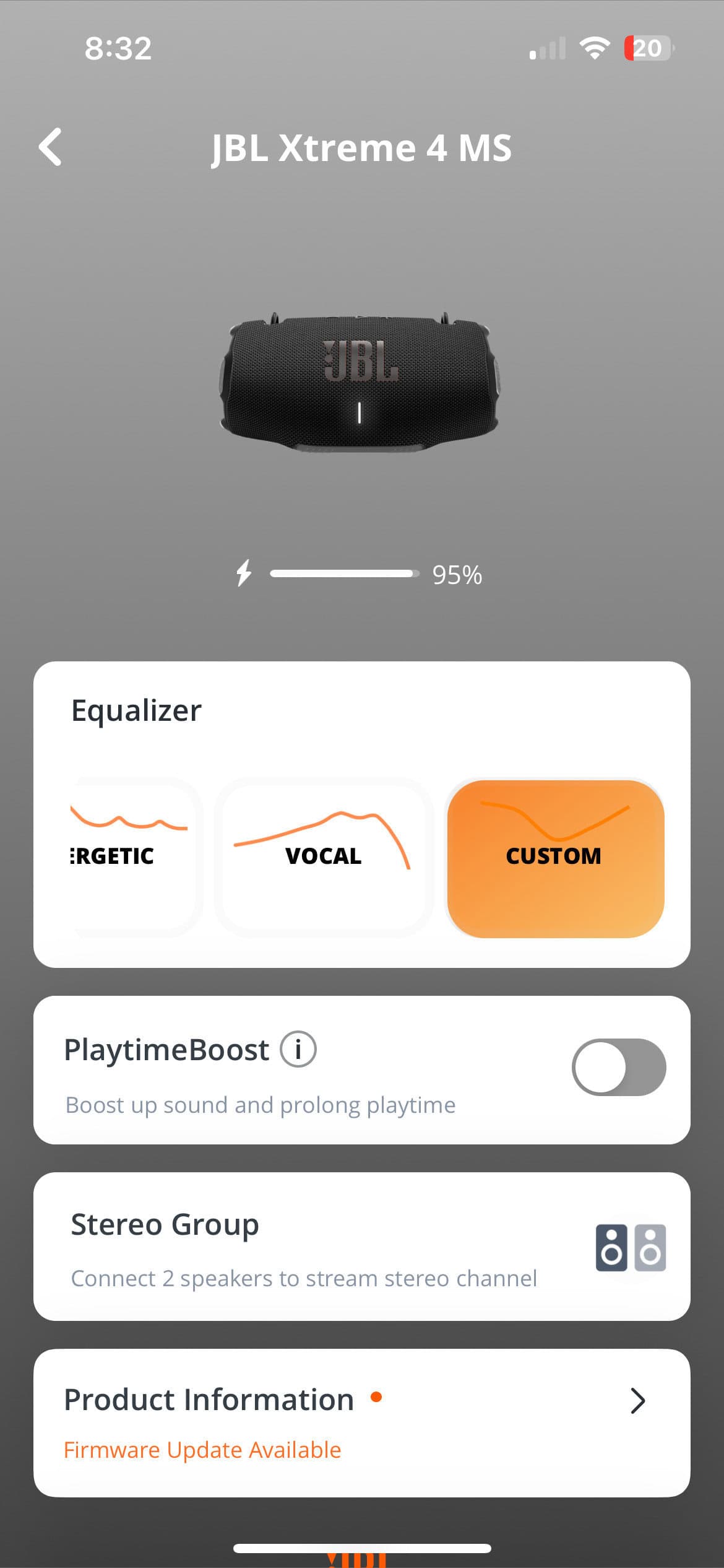 Inne sekcje obejmują uruchomienie wspomnianej wcześniej funkcji Playtime Boost. Dostępna jest też opcja tworzenia dźwięku stereo z innym głośnikiem obsługującym tę funkcję. Bezpośrednio w aplikacji można również sprawdzić aktualny poziom naładowania baterii. Na końcu znajdują się niezbędne informacje o produkcie.