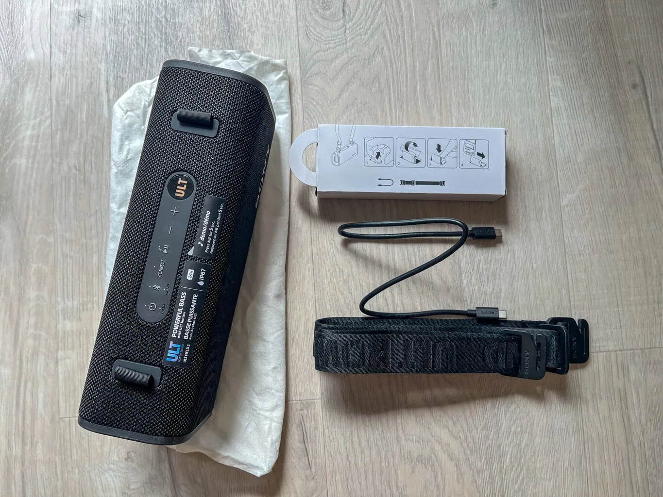 W zestawie głośnika Bluetooth Sony ULT Field 3, oprócz samego urządzenia w ochronnym etui, znajduje się kabel zasilający z końcówką USB-C, pasek do noszenia głośnika na ramieniu oraz niezbędna dokumentacja.