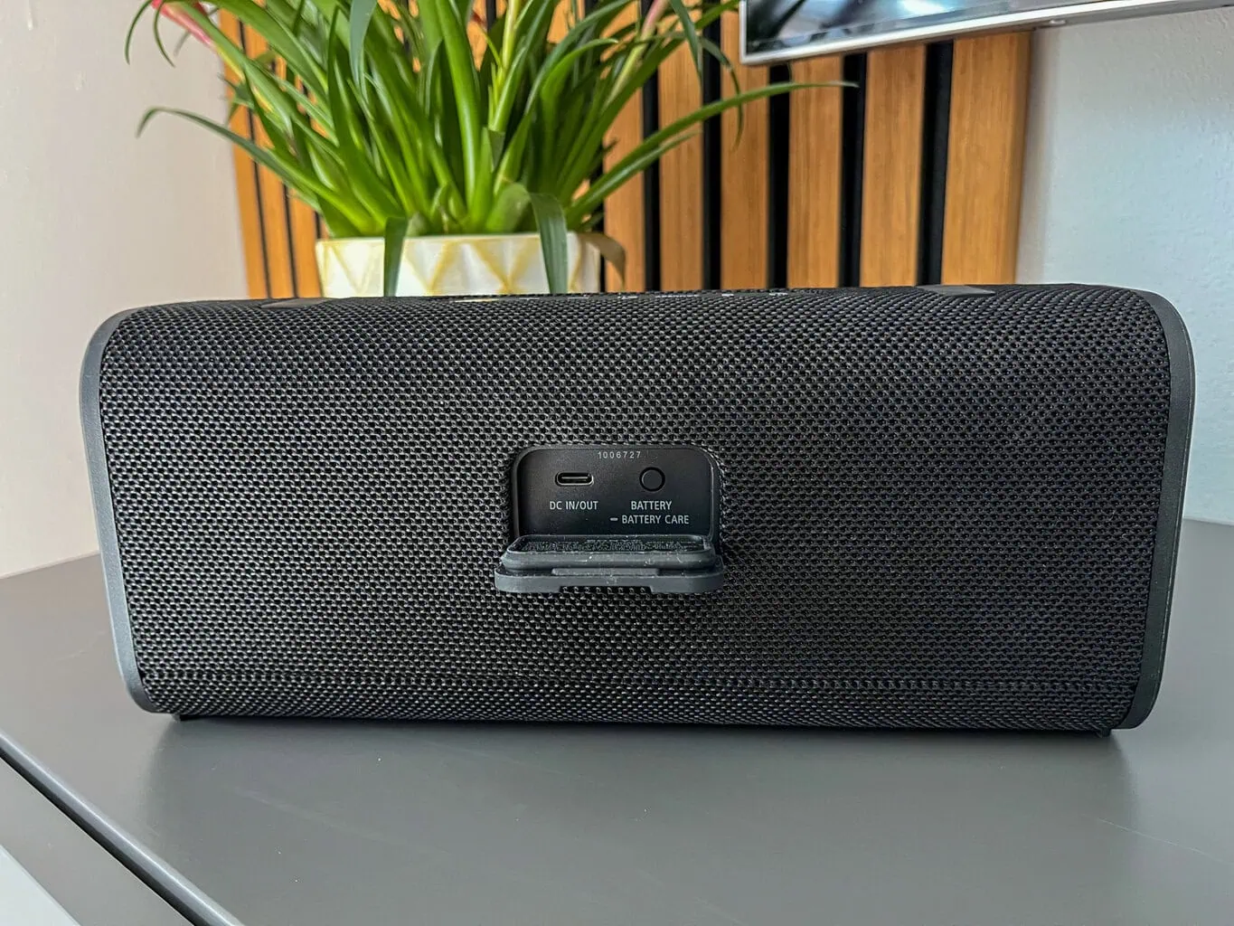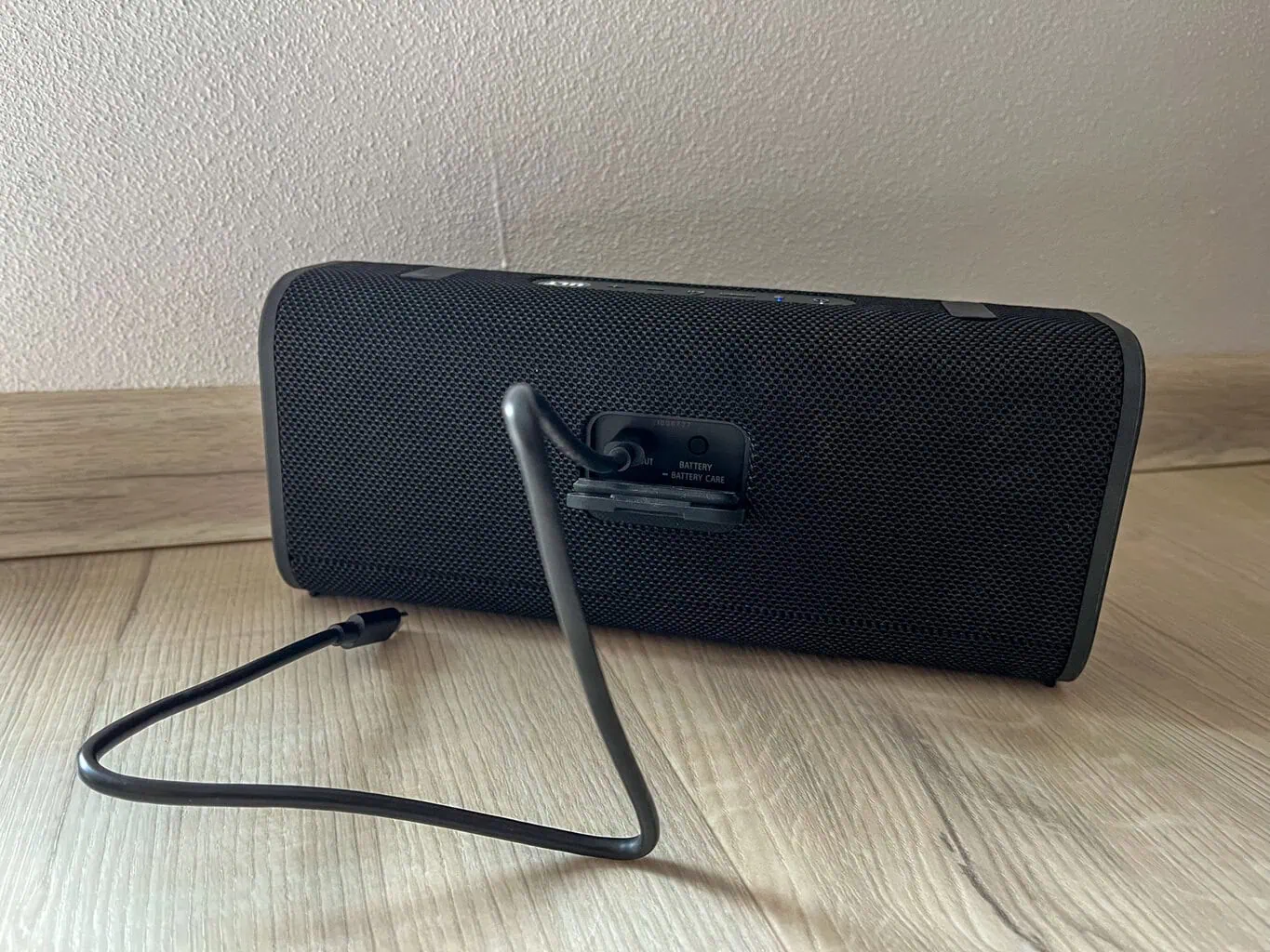Na tylnej stronie znajduje się gumowa osłona, po jej odsłonięciu uzyskasz dostęp do portu zasilania USB-C. Za jego pomocą możesz również ładować inne urządzenia, dzięki czemu głośnik może pełnić funkcję powerbanku. Obok portu znajduje się przycisk oznaczony jako Battery Care. Jeśli przytrzymasz go przez dwie sekundy, głośnik zoptymalizuje tryb ładowania, aby wydłużyć żywotność baterii (na przykład zapobiega naładowaniu akumulatora do 100%). Innych portów (np. 3,5 mm jack) niestety tutaj nie znajdziesz.