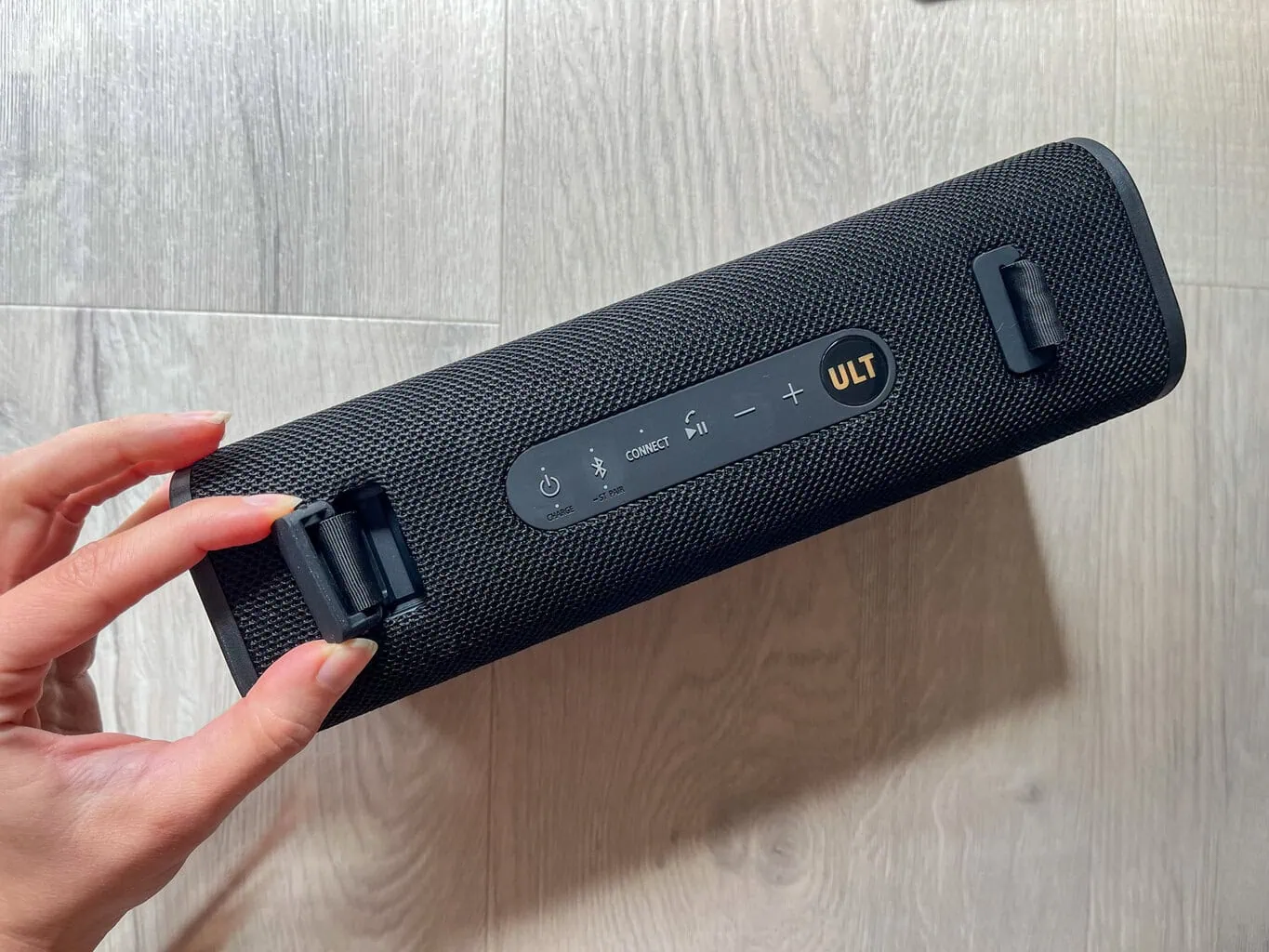 Głośnik Sony ULT Field 3 został zaprojektowany z myślą o częstym przenoszeniu. Muszę przyznać, że gdy po raz pierwszy wzięłam go do ręki, utwierdziłam się w przekonaniu, że bez problemu sobie z tym poradzi. Urządzenie wyróżnia się solidną obudową z tekstylną powłoką oraz miękkimi, plastikowymi bokami, które zapewniają ochronę przed uderzeniami.