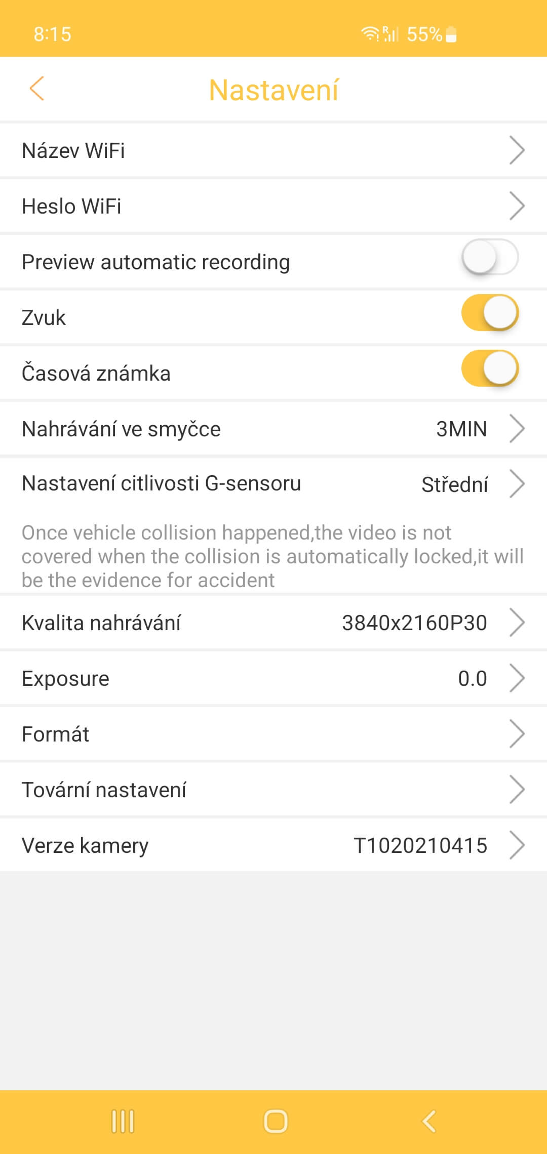 Aplikacja jest przejrzysta, ale tylko częściowo przetłumaczona na język polski. Umożliwia zmianę niektórych ustawień kamery samochodowej lub oglądanie nagrań z przedniej lub tylnej kamery (jeśli jest podłączona). Dostępna jest również galeria podzielona na migawki, nagrania awaryjne i normalne nagrania.