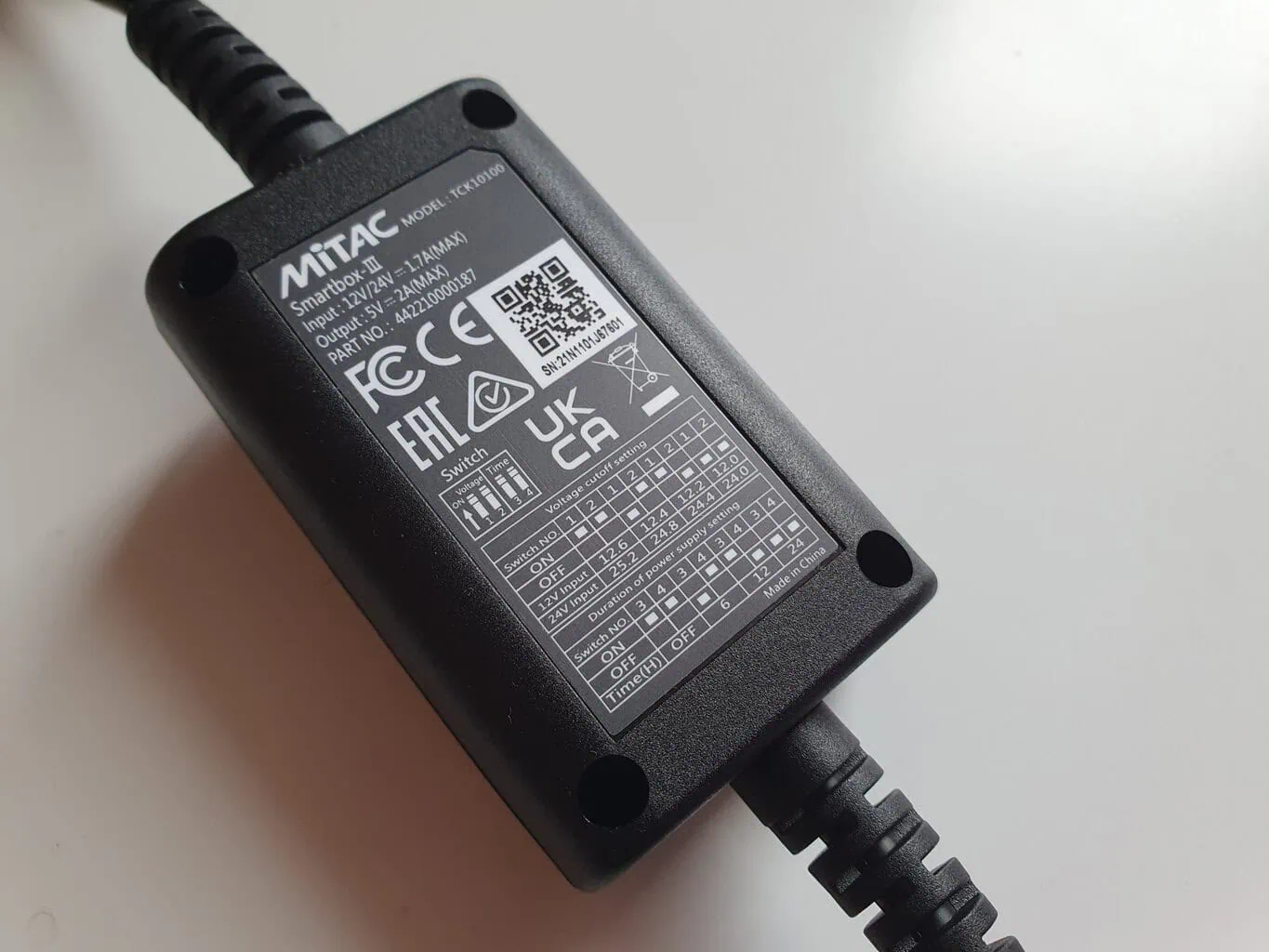 Po podłączeniu do skrzynki zapala się dioda stanu i trzeba ustawić cztery piny. Pierwsze dwa służą do regulacji napięcia granicznego. Jeśli napięcie baterii spadnie do tej wartości, zasilanie kamery zostanie wyłączone. Drugie dwa piny są przeznaczone do ustawienia czasu, przez jaki kamera ma być zasilana – od 6 godzin do ciągłego zasilania.