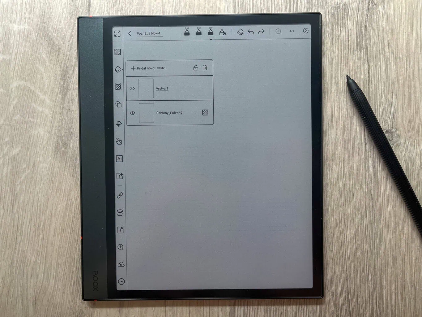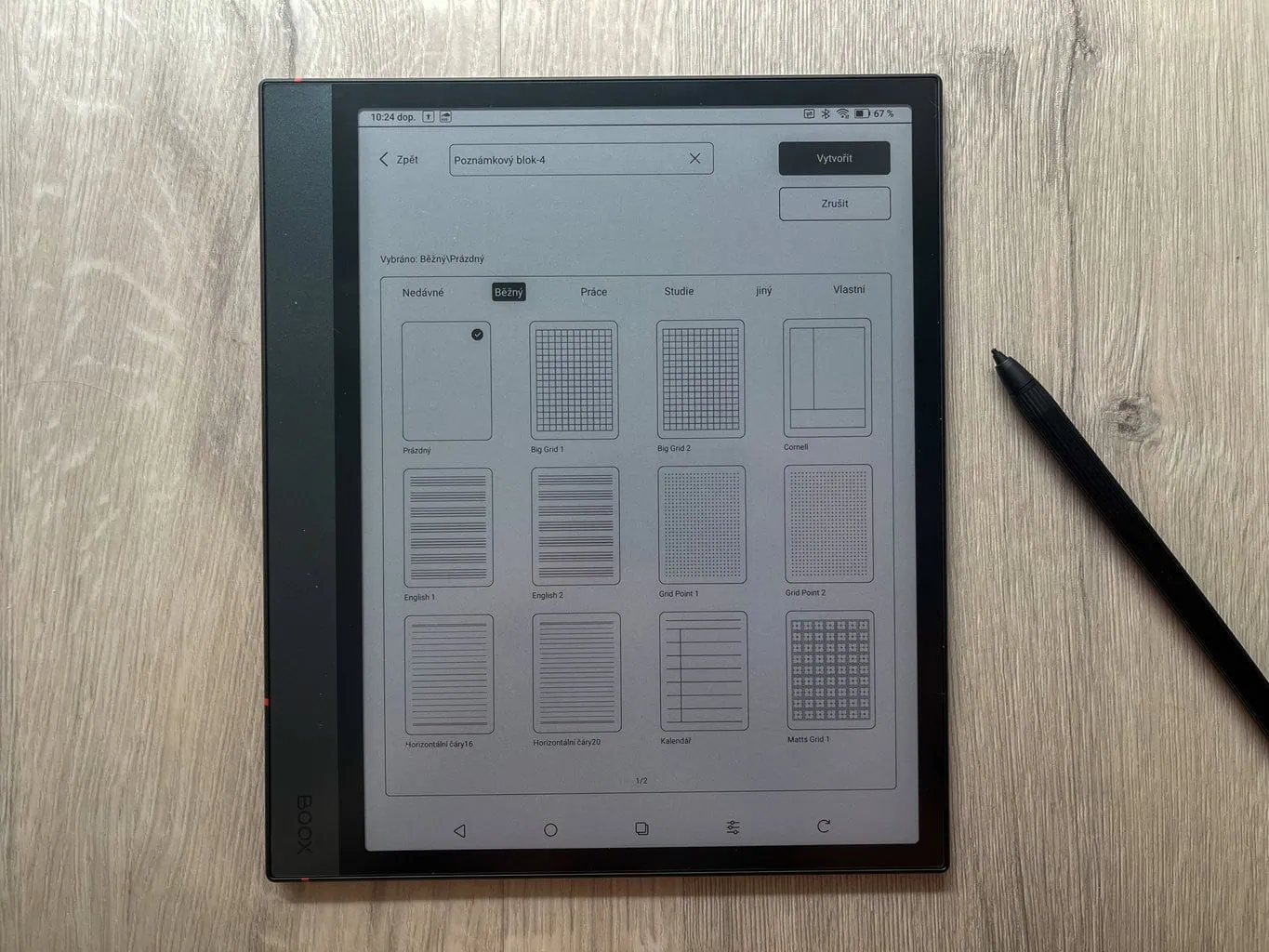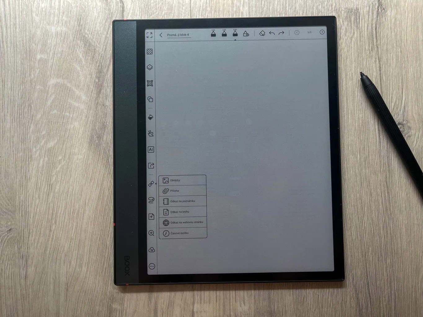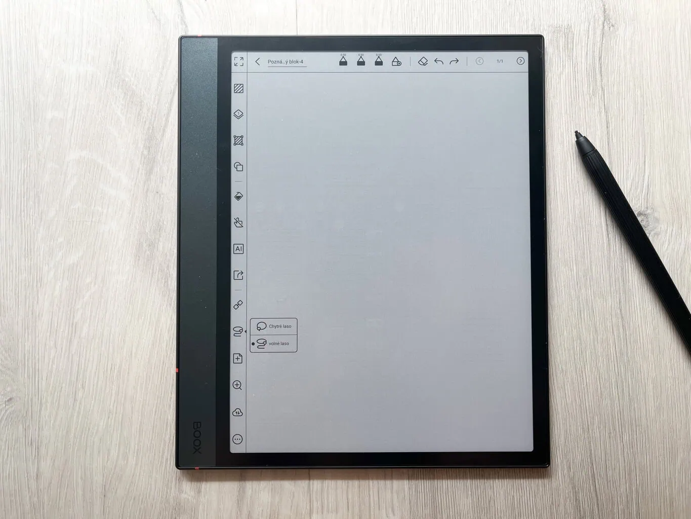 Główną funkcją ONYX BOOX NOTE 4 C jest tworzenie cyfrowych notatek. Oprócz całkowicie pustych stron dostępne są także praktyczne szablony, które mogą ułatwić pracę (na przykład tygodniowe planery i podobne). W przeciwieństwie do notatników reMarkable każda strona w ramach jednej notatki może mieć inny szablon. Nowością jest także możliwość wyboru, czy nowa strona ma zostać dodana przed, czy za aktualną stroną.