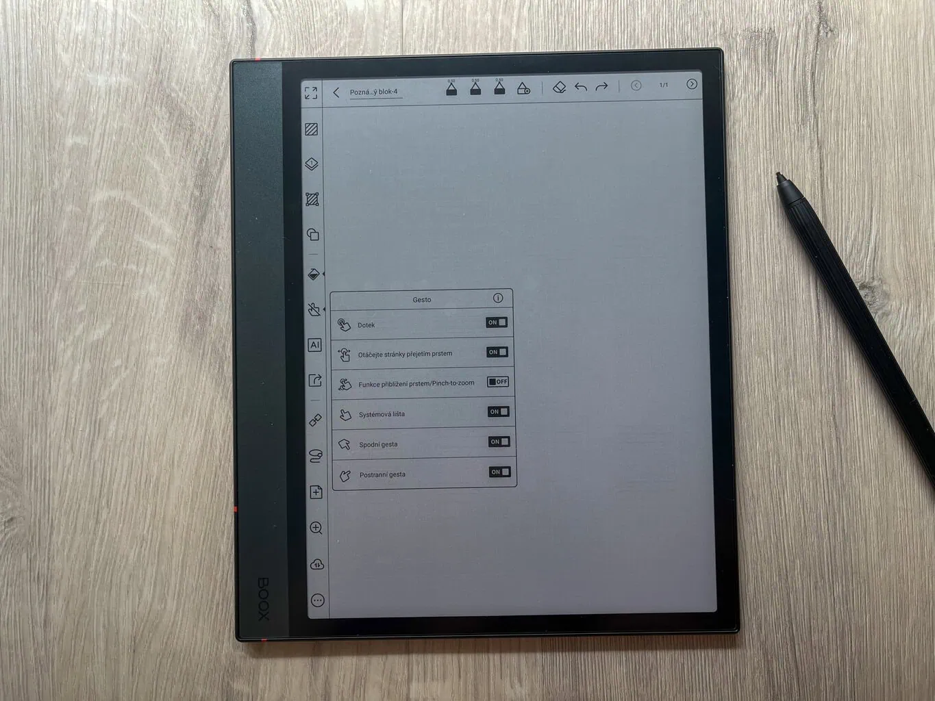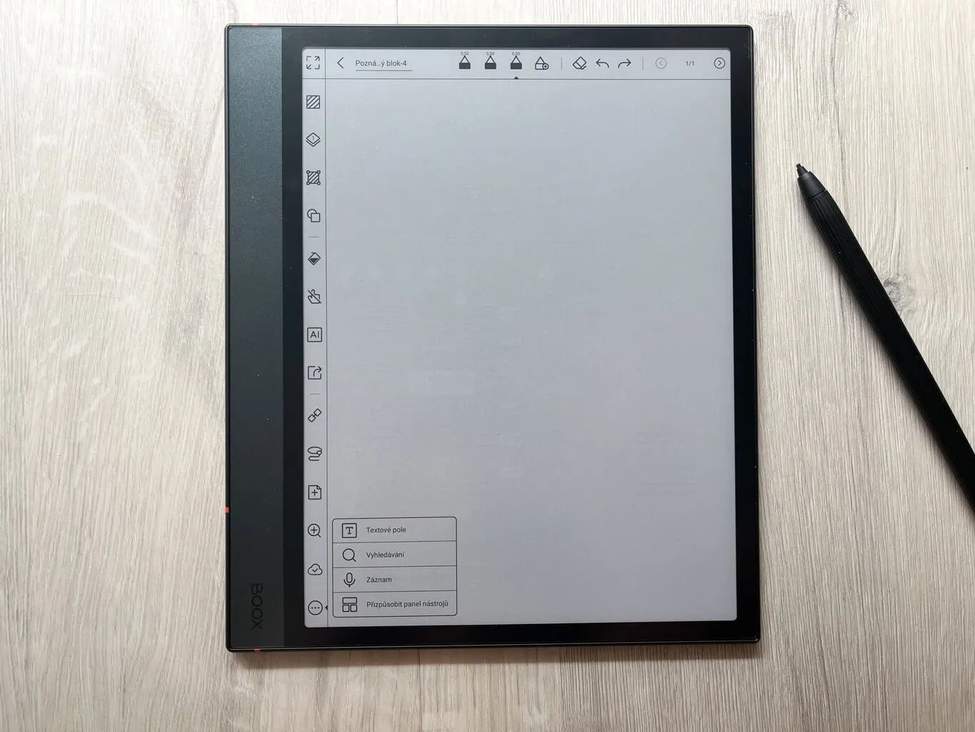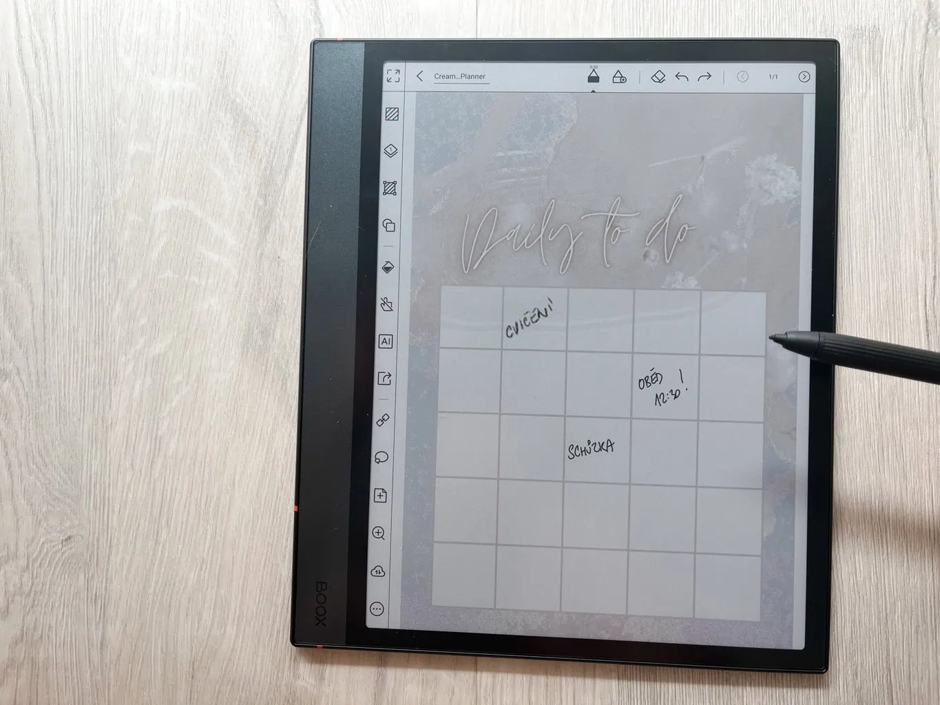 Główną funkcją ONYX BOOX NOTE 4 C jest tworzenie cyfrowych notatek. Oprócz całkowicie pustych stron dostępne są także praktyczne szablony, które mogą ułatwić pracę (na przykład tygodniowe planery i podobne). W przeciwieństwie do notatników reMarkable każda strona w ramach jednej notatki może mieć inny szablon. Nowością jest także możliwość wyboru, czy nowa strona ma zostać dodana przed, czy za aktualną stroną.
