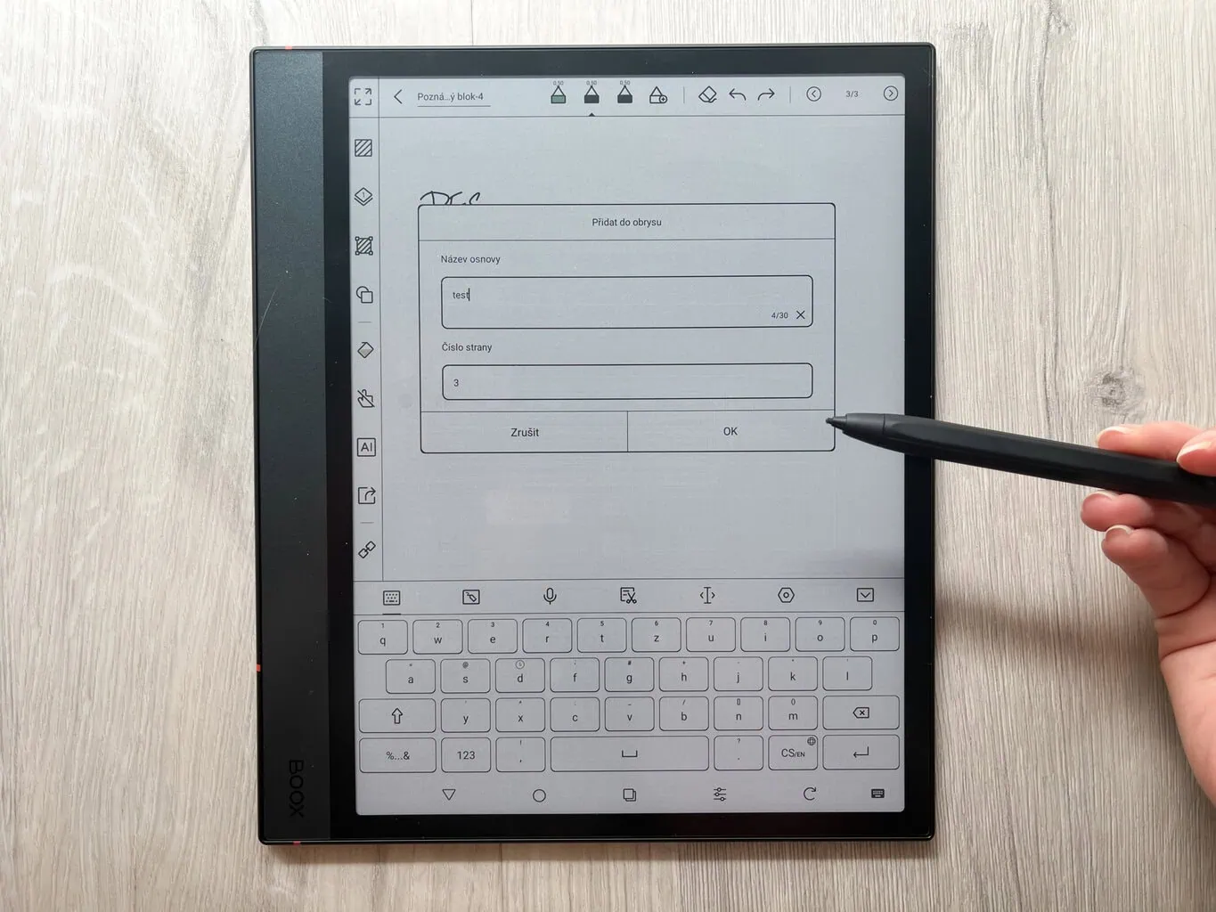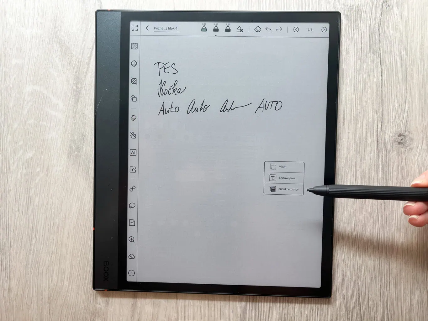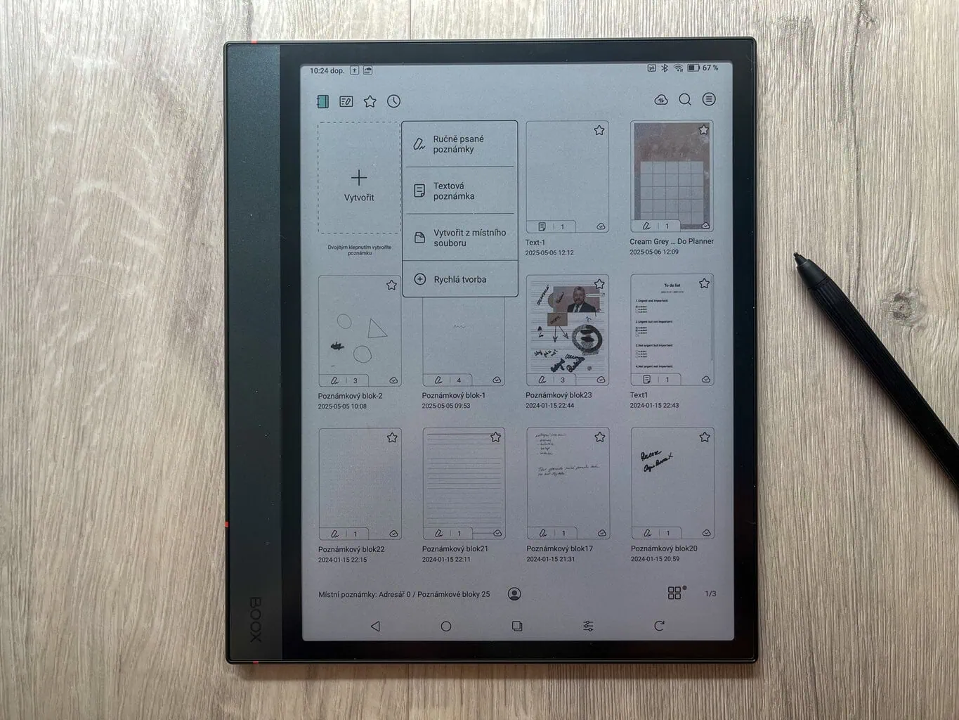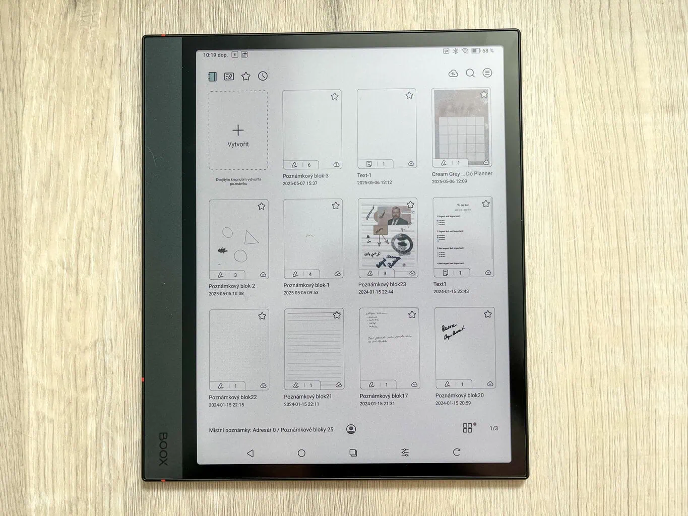 Główną funkcją ONYX BOOX NOTE 4 C jest tworzenie cyfrowych notatek. Oprócz całkowicie pustych stron dostępne są także praktyczne szablony, które mogą ułatwić pracę (na przykład tygodniowe planery i podobne). W przeciwieństwie do notatników reMarkable każda strona w ramach jednej notatki może mieć inny szablon. Nowością jest także możliwość wyboru, czy nowa strona ma zostać dodana przed, czy za aktualną stroną.