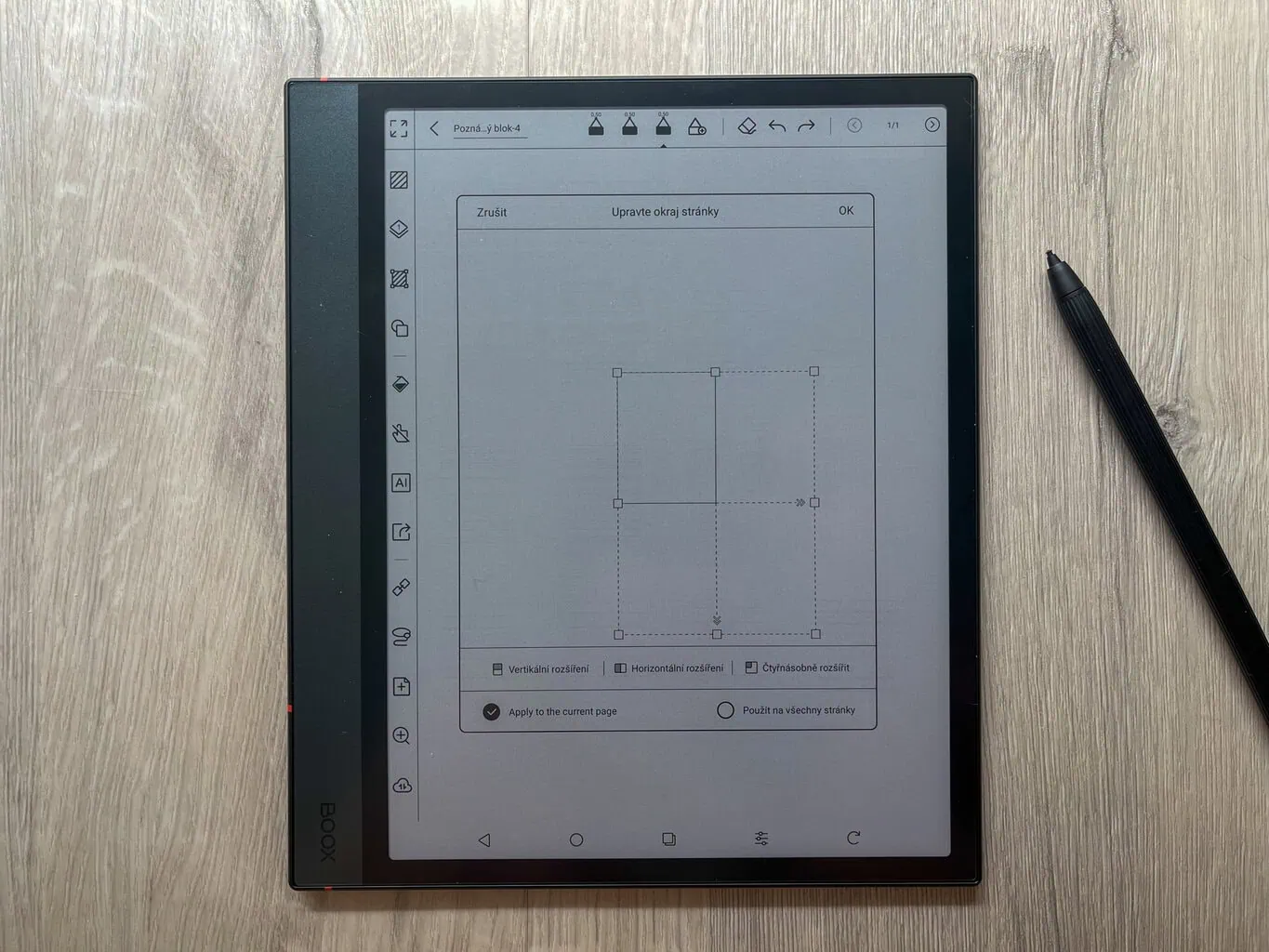 Podczas tworzenia notatek wciąż jesteś ograniczona krawędzią wyznaczoną przez rozmiar strony. Jeśli chcesz przesunąć się choć trochę dalej, możesz to zrobić za pomocą funkcji Edycja marginesu strony, która pozwala poszerzyć prawy lub dolny margines płótna (maksymalnie jednak do rozmiaru 2x2). Z nieskończoną stroną, która przy niektórych notatkach jest bardzo praktyczna, spotkasz się w konkurencyjnym reMarkable 2 oraz Paper Pro i iPadzie.