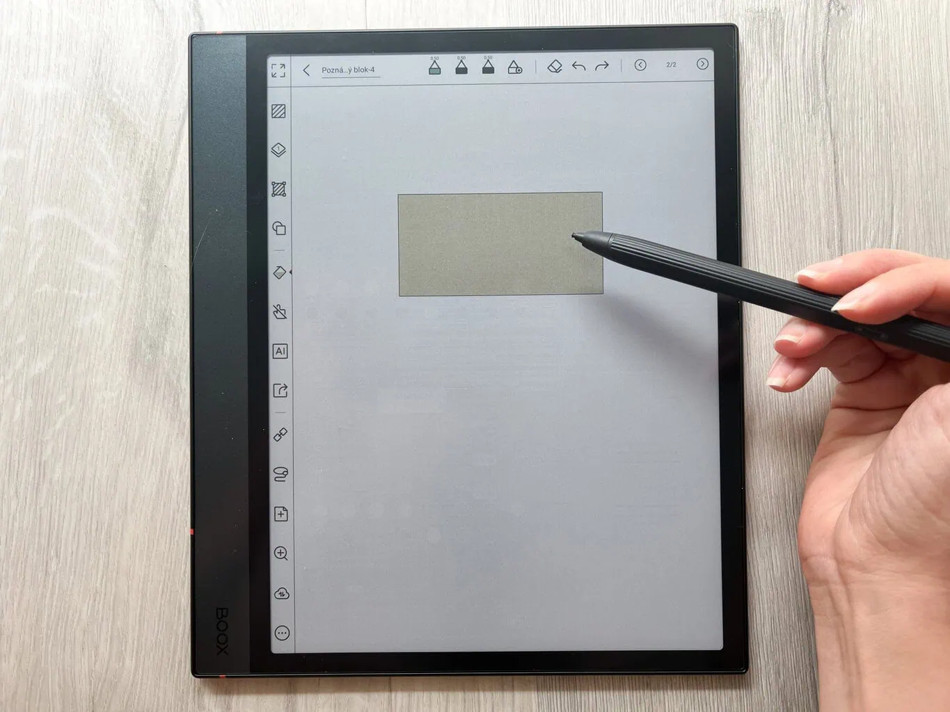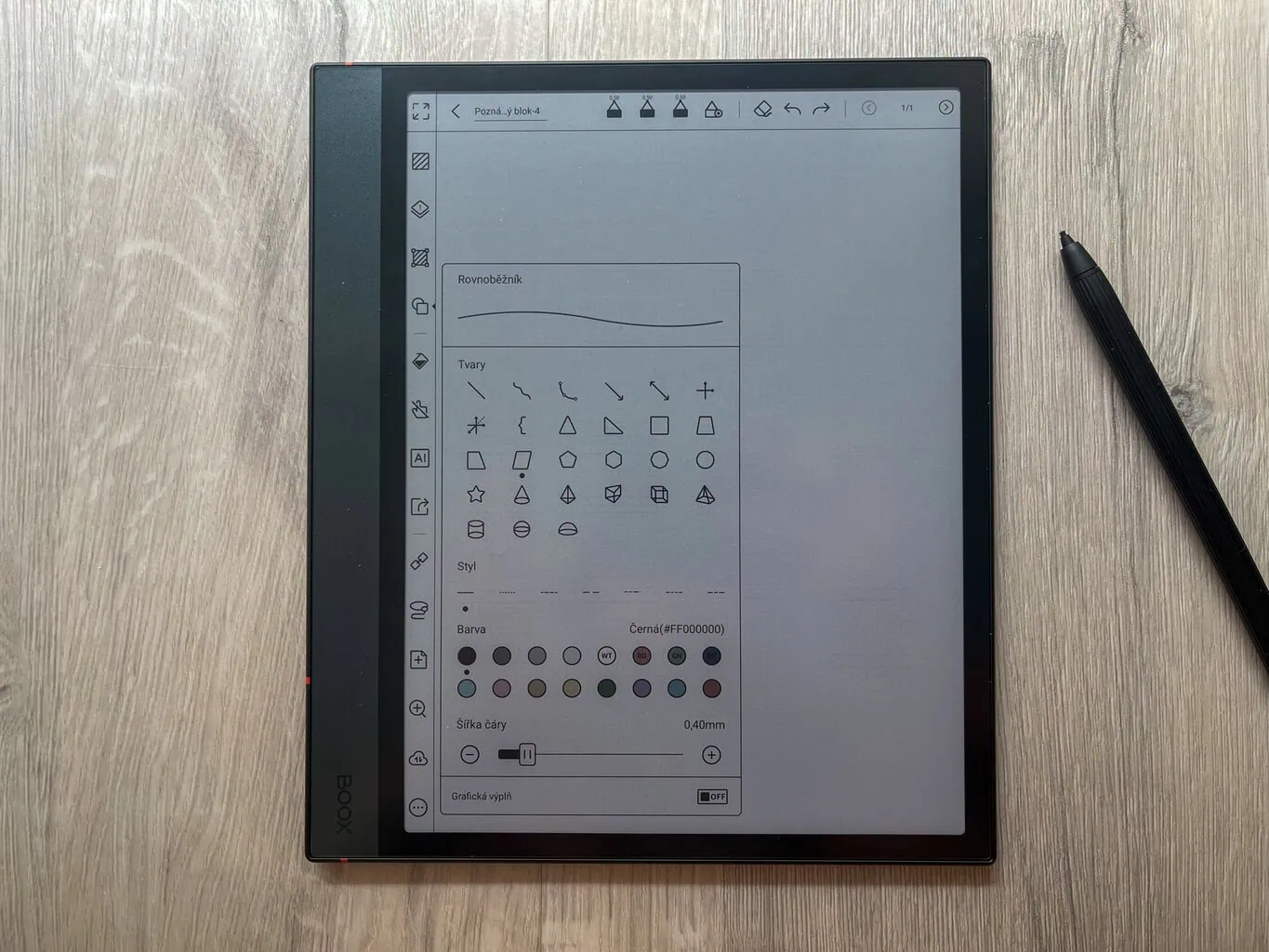 ONYX BOOX oferuje także kilka różnych gotowych kształtów i stylów linii. Poszczególne kształty możesz wypełnić jednolitym kolorem (ponownie, wybór ogranicza się do kilku dostępnych odcieni). Wielkość kształtu łatwo ustawisz, przeciągając pióro. Całość możesz również zaznaczyć, obracać lub ponownie dostosować jej rozmiar.