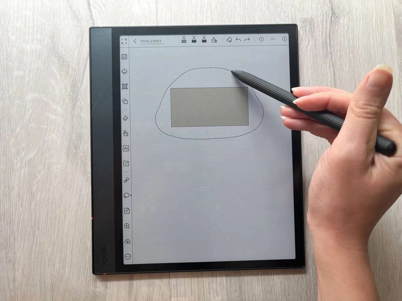 Po włączeniu funkcji Perfekcyjny kształt, notatnik automatycznie zamieni odręcznie narysowany kształt w idealny obiekt. Wystarczy na końcu lekko przytrzymać pióro. Dotyczy to nie tylko kształtów, ale także linii. Gdy skończysz rysować kształt, jest on automatycznie zaznaczony i możesz dalej z nim pracować (na przykład zmienić jego rozmiar). Tę funkcję ONYX BOOX NOTE AIR 3 C nie posiadał – trzeba było ponownie zaznaczyć obiekt za pomocą lassa, aby móc go edytować.