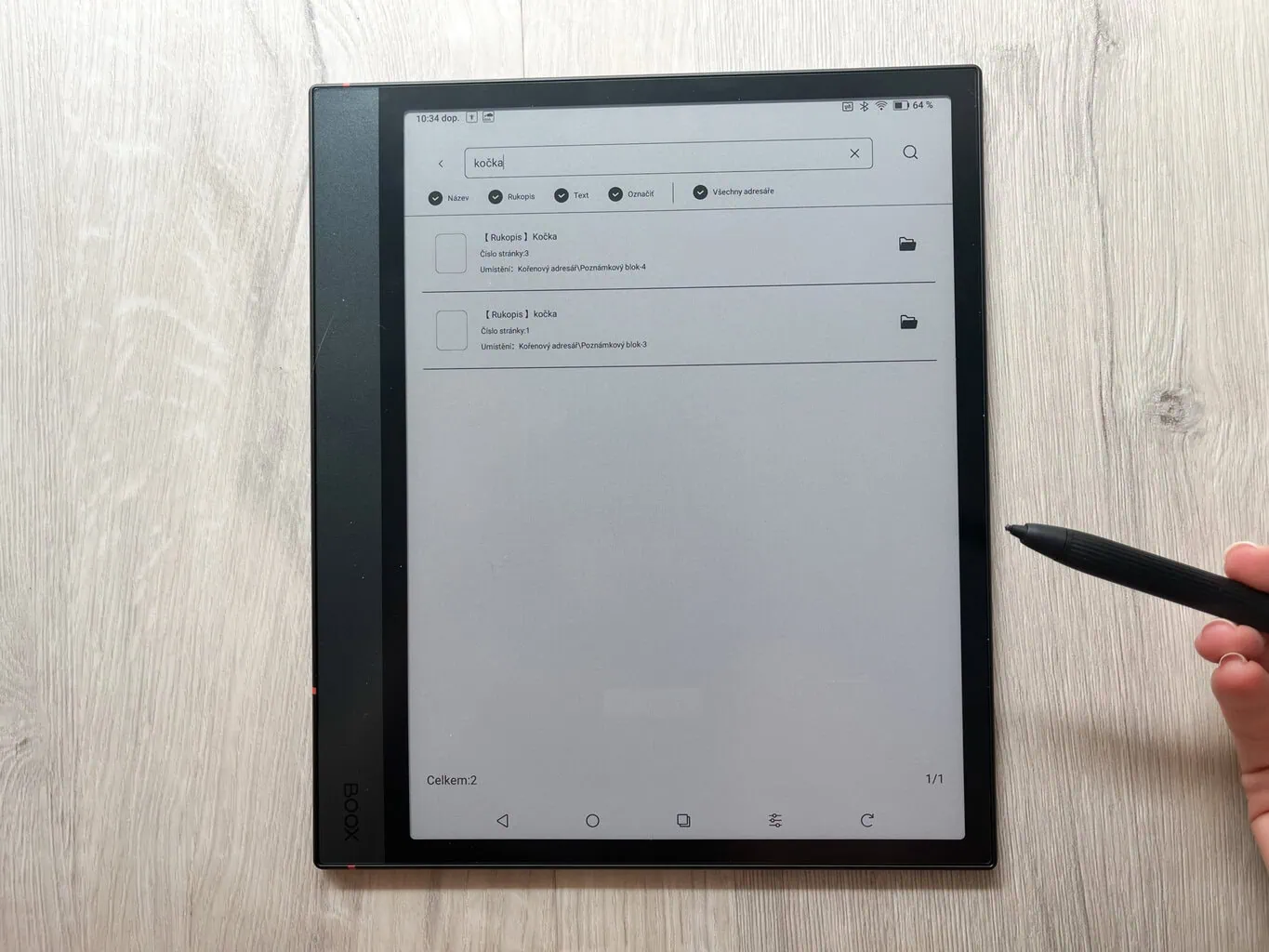 ONYX BOOX umożliwia wyszukiwanie we wszystkich notatkach. Wynikiem jest lista wszystkich notatek, w których występuje dane słowo. Do wyszukiwania można także użyć aplikacji mobilnej oraz wersji przeglądarkowej.
