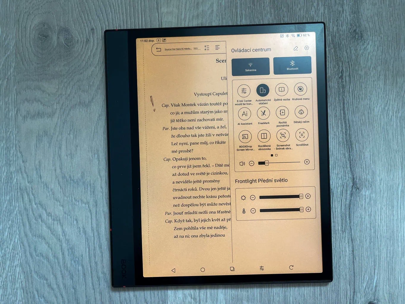 Podobnie jak ONYX BOOX NOTE AIR 3 C, jego następca również posiada podświetlenie. Moim zdaniem w ONYX BOOX NOTE 4 C podświetlenie jest jeszcze lepsze i przy maksymalnej jasności w obu notatnikach to właśnie nowszy model oferuje jaśniejszy ekran. Tak jak w poprzedniku, pozostawiono możliwość wyboru barwy światła, co bardzo doceniam. Podczas czytania przed snem zdecydowanie wolę cieplejszą barwę podświetlenia, która mniej męczy oczy.