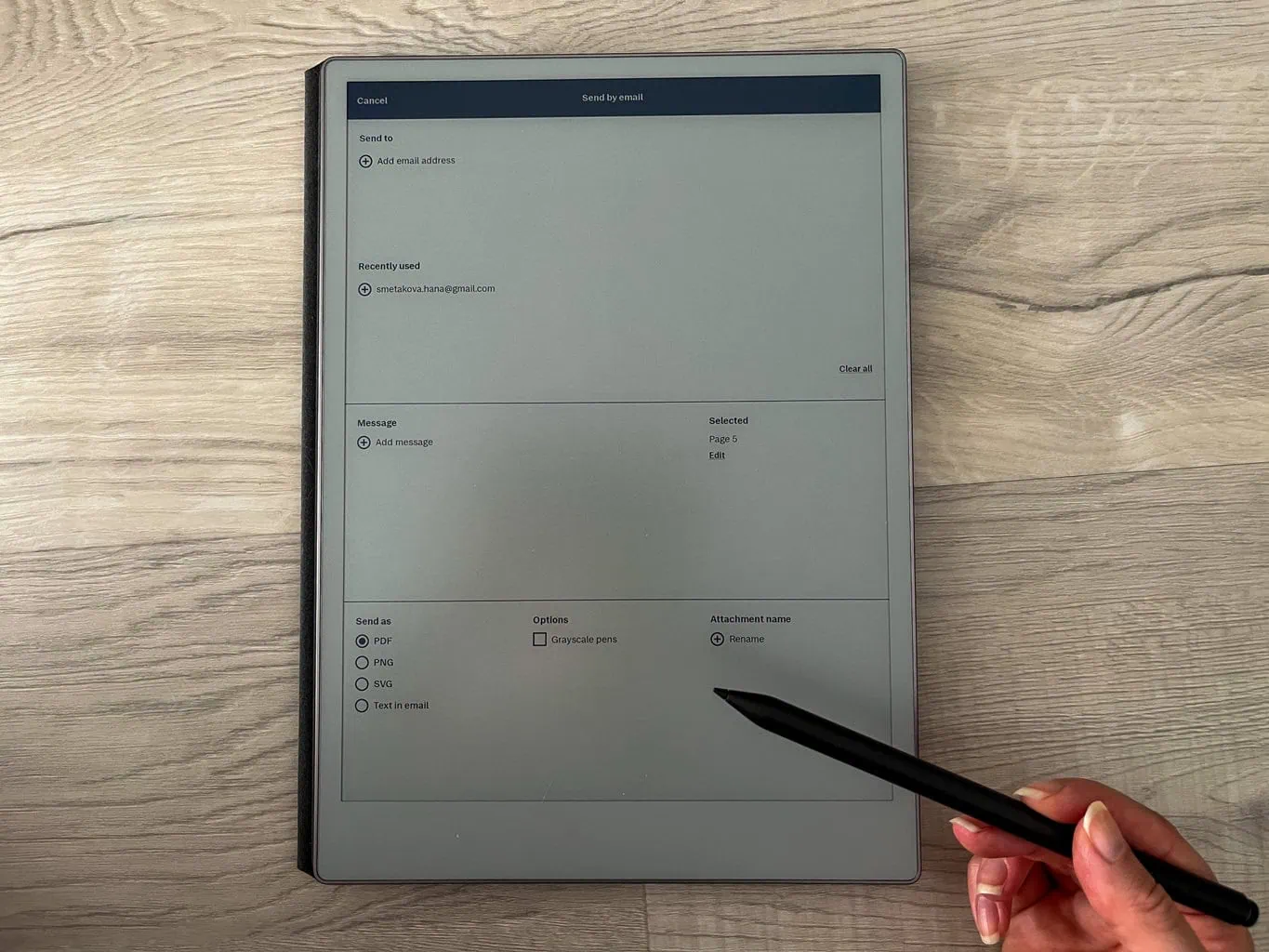 Możesz wysyłać e-mailem notatki utworzone z cyfrowego notatnika. Możesz wysłać określoną stronę notatki lub cały dokument. Do załącznika można dodać własny tekst za pomocą klawiatury ekranowej. Możesz także wybrać, czy tekst z odręcznie napisanego dokumentu ma zostać dołączony jako załącznik, czy też ma zostać uwzględniony w treści wiadomości e-mail. W ten sposób możesz udostępniać swoje notatki i zapiski, na przykład współpracownikom lub innym studentom.