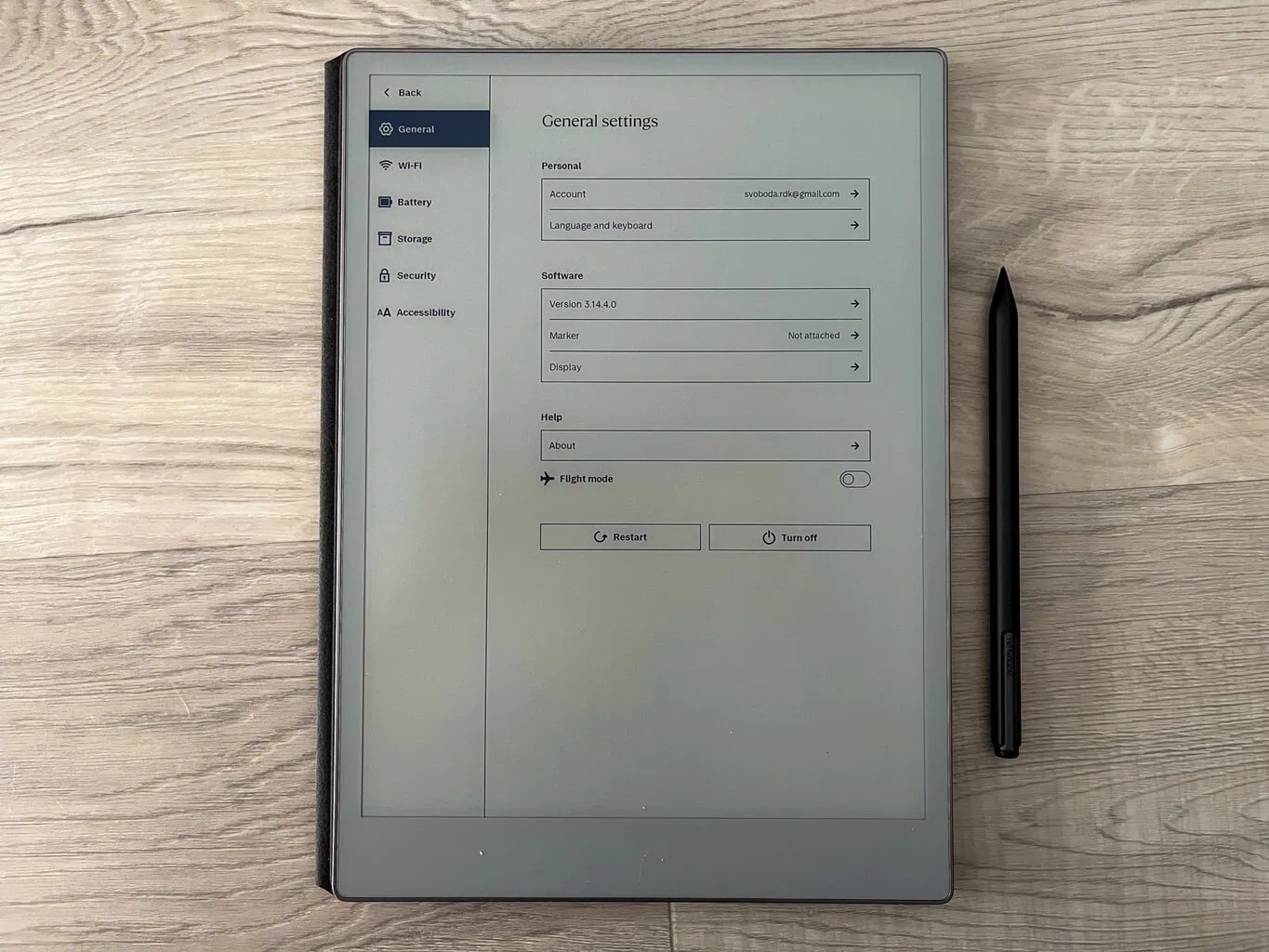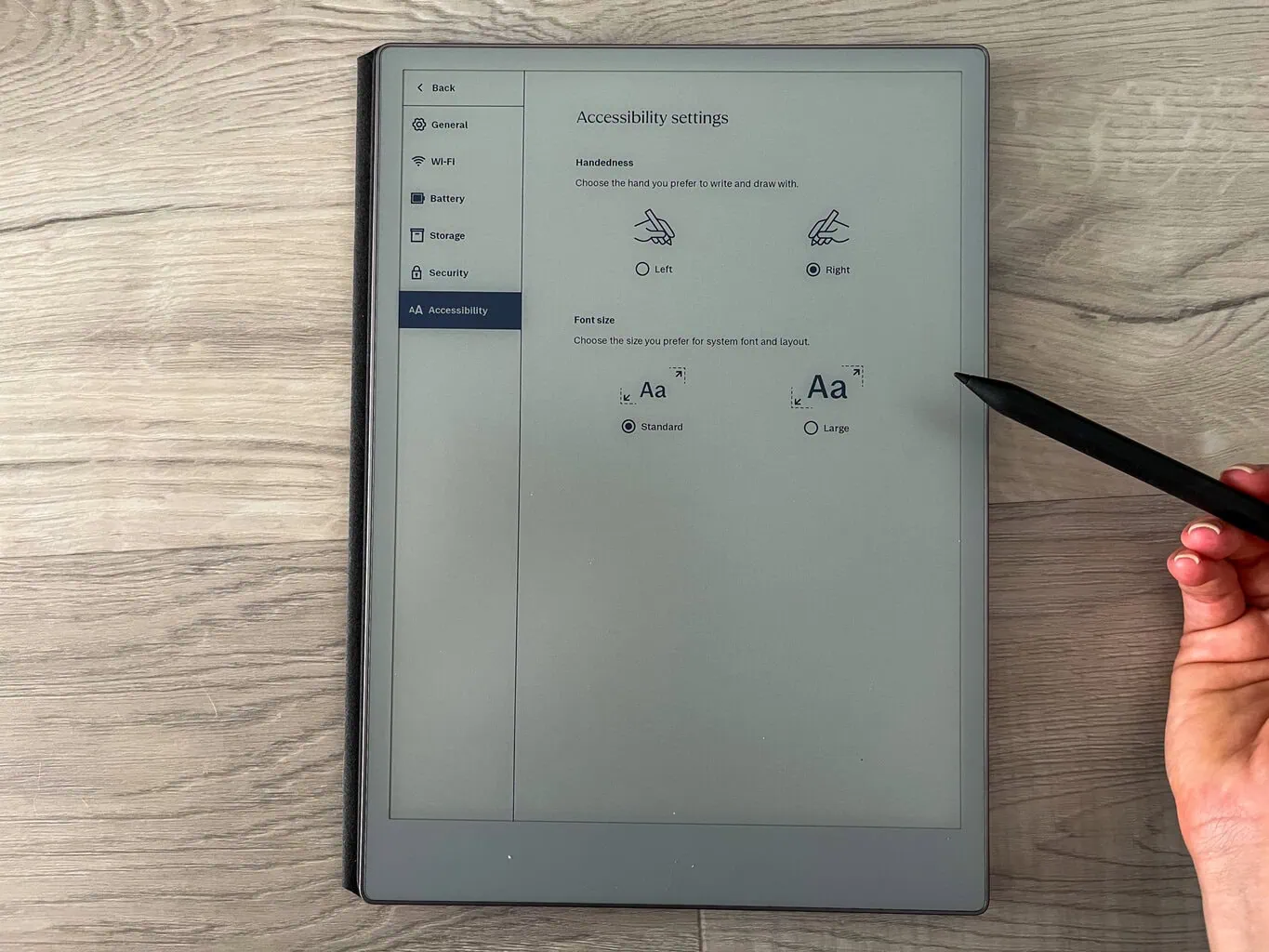Podobnie jak w przypadku reMarkable 2, urządzenie można przełączyć w tryb dla prawo- lub leworęcznych i w razie potrzeby dostosować rozmiar czcionki.