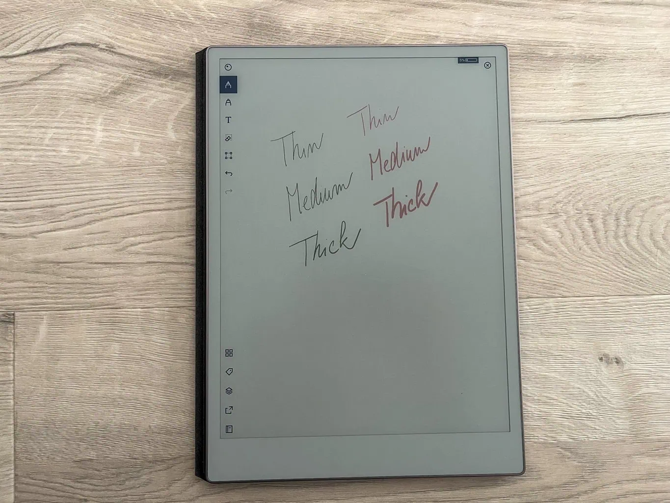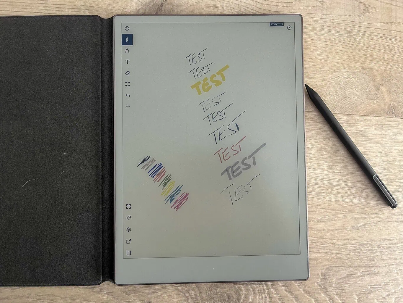 Ponieważ rysik wykrywa zarówno siłę nacisku na ekran, jak i kąt nachylenia, pisanie jest naprawdę bardzo podobne do pisania na tradycyjnym papierze. Sama reakcja jest natychmiastowa, a ogólne wrażenia z pisania są naprawdę doskonałe. W przeciwieństwie do pióra reMarkable 2, plastikowa stalówka jest nieco bardziej wytrzymała i sprawia wrażenie trwalszej.