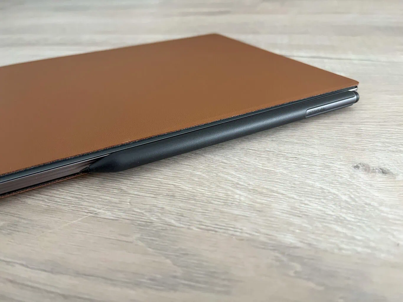 Wspomniane pióro służy do pisania i rysowania. Jak wspomniałam, trzeba je ładować (podobnie jak na przykład Apple Pencil dla iPada). Ponieważ jest magnetyczne, można je po prostu przypiąć do krawędzi notatnika i mieć je zawsze pod ręką. W nowym etui znajdziesz także uchwyt, który utrzymuje rysik stabilnie na swoim miejscu. Jeśli go nie użyjesz i zawadzisz lub uderzysz czymś o rysik, to może on odpaść. Dlatego zalecam, aby zawsze zabezpieczać go w ten sposób.