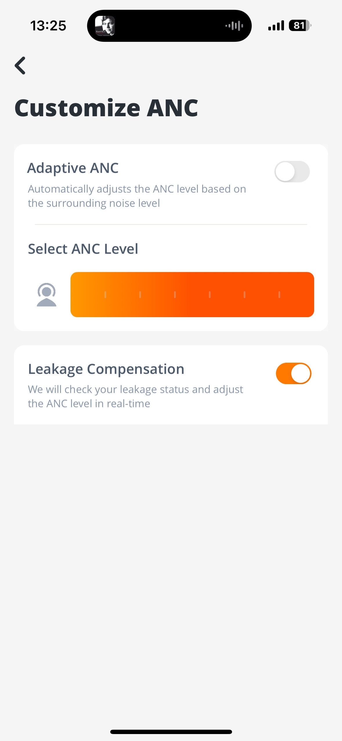 Słuchawki posiadają również adaptacyjny tryb ANC, który automatycznie dostosowuje siłę tłumienia szumów do głośności otoczenia. Możesz włączyć ten tryb w aplikacji, a także dostosować intensywność każdego trybu.