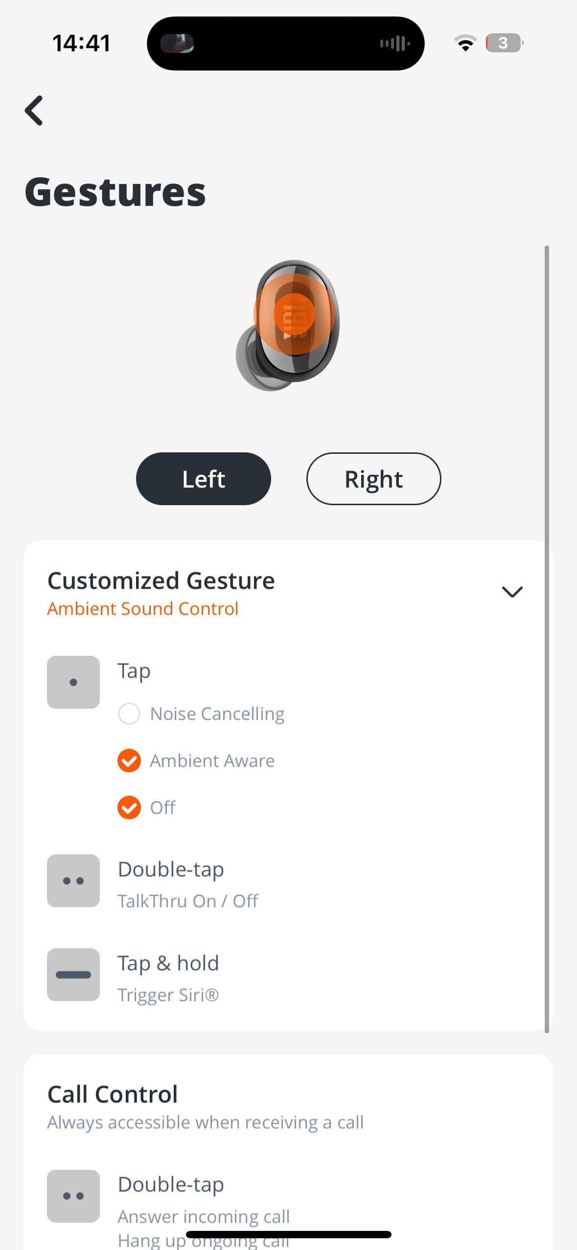 Każda słuchawka odpowiada również za jedną z trzech funkcji - wybieraniem trybów przepustowości, regulacją głośności lub odtwarzaniem. Jednak AirPods Pro 2 udaje się kontrolować wszystkie trzy wyżej wymienione funkcje z poziomu słuchawek w tym samym czasie (w przypadku Beam 3 ostatecznie brakuje jednej z nich). Na obronę JBL należy wspomnieć, że istnieje również tryb TalkThru ukryty wśród trybów przepustowości - więcej na ten temat później. W aplikacji można również dokładniej dostosować gesty (zamienić funkcje boków słuchawek lub całkowicie dezaktywować sterowanie dotykowe), co moim zdaniem jest świetną funkcją.