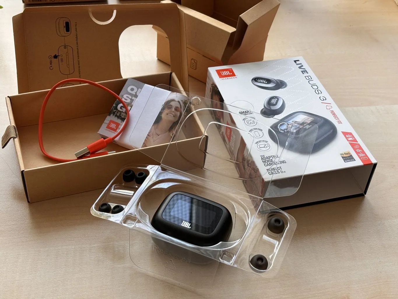 Słuchawki bezprzewodowe JBL Live Buds 3 są sprzedawane w dość dużym pudełku, w którym znajdują się: