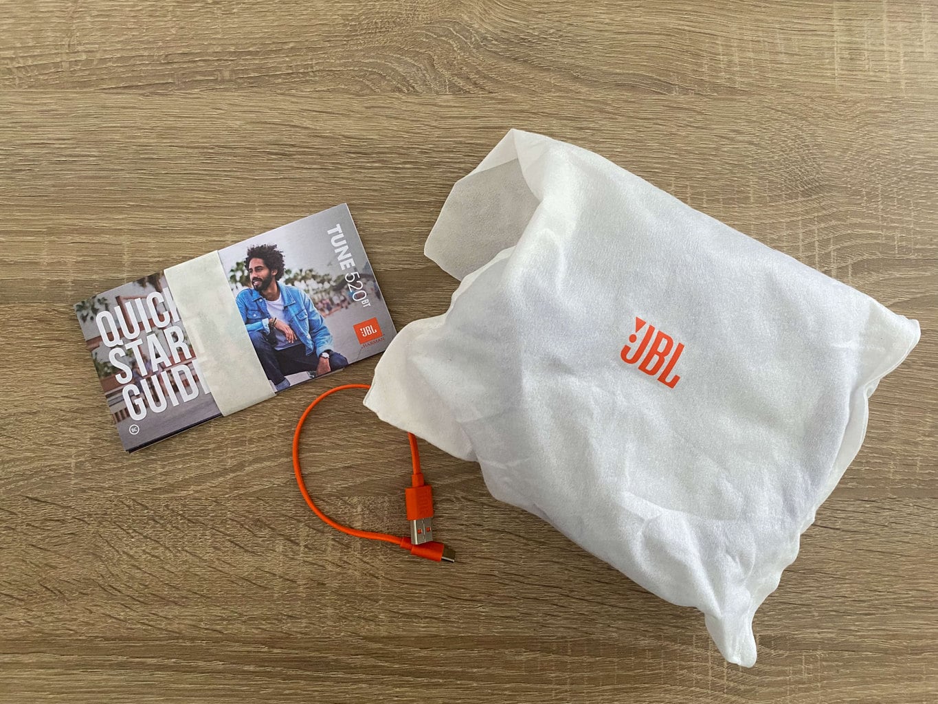 Bezprzewodowe słuchawki JBL Tune 520BT sprzedawane są w eleganckim pudełku bez żadnych niespodzianek. Oprócz samych słuchawek w materiałowym woreczku znajdziemy instrukcję obsługi oraz stosunkowo krótki kabel zasilający ze złączem USB-C. Podczas ładowania słuchawki muszą znajdować się bardzo blisko gniazdka elektrycznego. Jeśli masz gniazdko blisko ziemi i chcesz położyć słuchawki np. na zwykłym stole, to kabel tam nie dosięgnie.