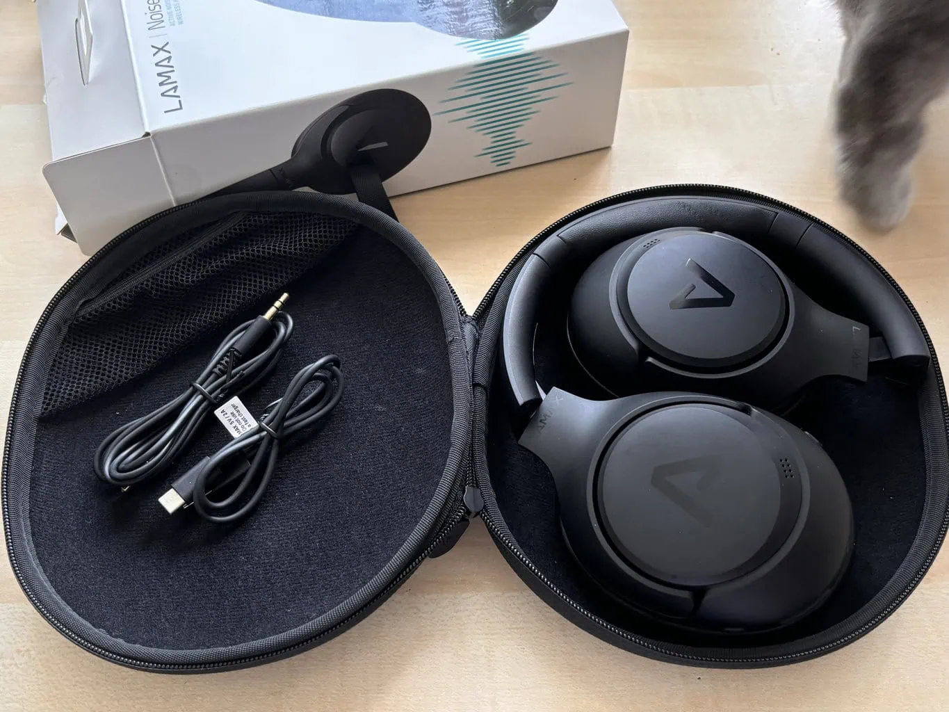 Słuchawki bezprzewodowe LAMAX NoiseComfort2 ANC są sprzedawane w nieco bogatszym opakowaniu niż to zwykle bywa w przypadku tradycyjnych słuchawek. Oprócz samych słuchawek i stosunkowo krótkiego kabla zasilającego USB-C, w opakowaniu znajdziesz również kabel AUX 3,5 mm. Uchroni Cię to przed rozładowaniem się słuchawek (ale tylko wtedy, gdy Twoje urządzenie posiada wyjście słuchawkowe). Należy również pamiętać, że po podłączeniu kabla przyciski (w tym ANC) nie działają.