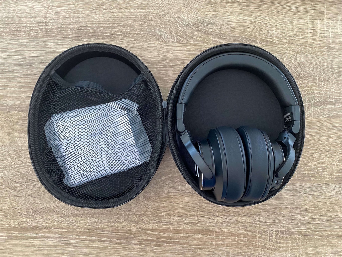 Zaletą tych bezprzewodowych słuchawek jest niewątpliwie obecność wyściełanego etui, które sprawia, że ich przenoszenie jest łatwe i przede wszystkim bezpieczne. Wewnątrz etui znajduje się praktyczna siatka, która służy na przykład do przechowywania kabli.