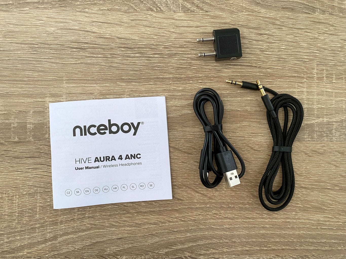 Słuchawki bezprzewodowe Niceboy HIVE Aura 4 ANC sprzedawane są w stosunkowo dużym i lekkim pudełku. Wymiary wynoszą 22,5 × 19 × 10,5 cm, a waga to 625 gramów. Po jego otwarciu można zobaczyć wyściełane etui, w którym znajdują się same słuchawki, kabel zasilający, kabel audio ze złączem jack 3,5 mm, adapter z podwójnym złączem jack 3,5 mm do podłączenia w samolocie oraz instrukcja obsługi.