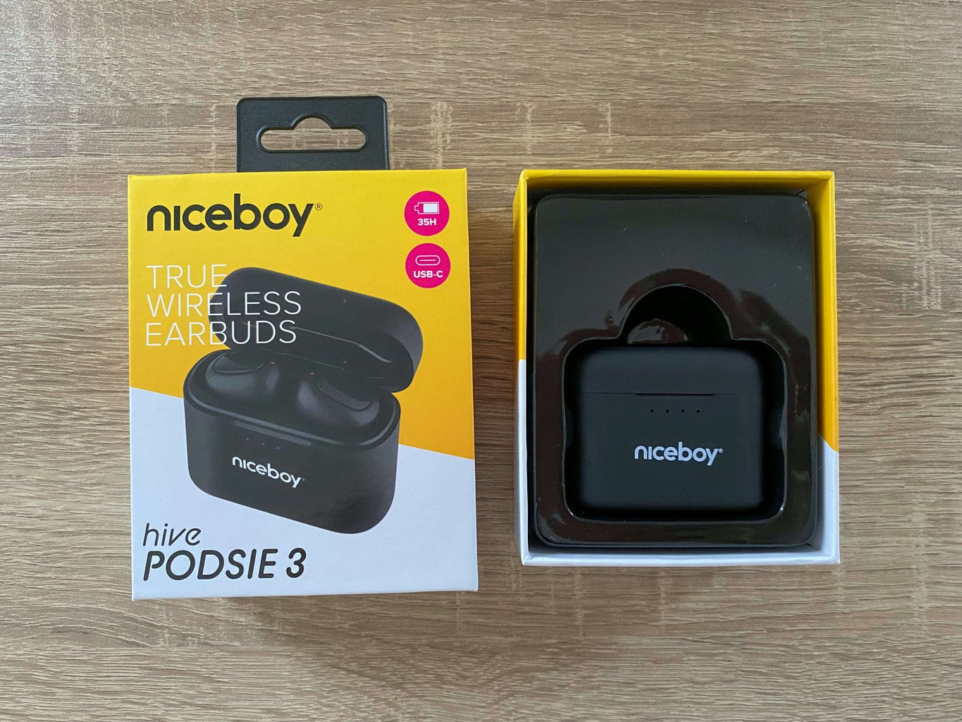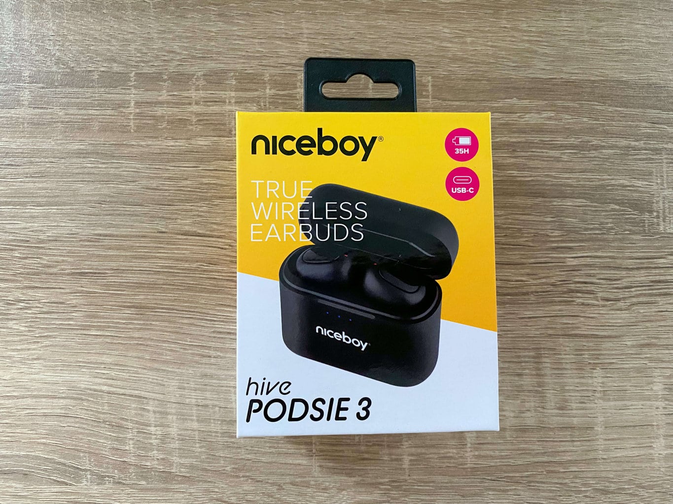 Słuchawki bezprzewodowe Niceboy HIVE Podsie 3 sprzedawane są w stosunkowo niewielkim żółto-białym pudełku o wymiarach 11 × 9 × 4 cm i wadze 127 gramów. Do wyboru jest czarna lub biała wersja słuchawek.