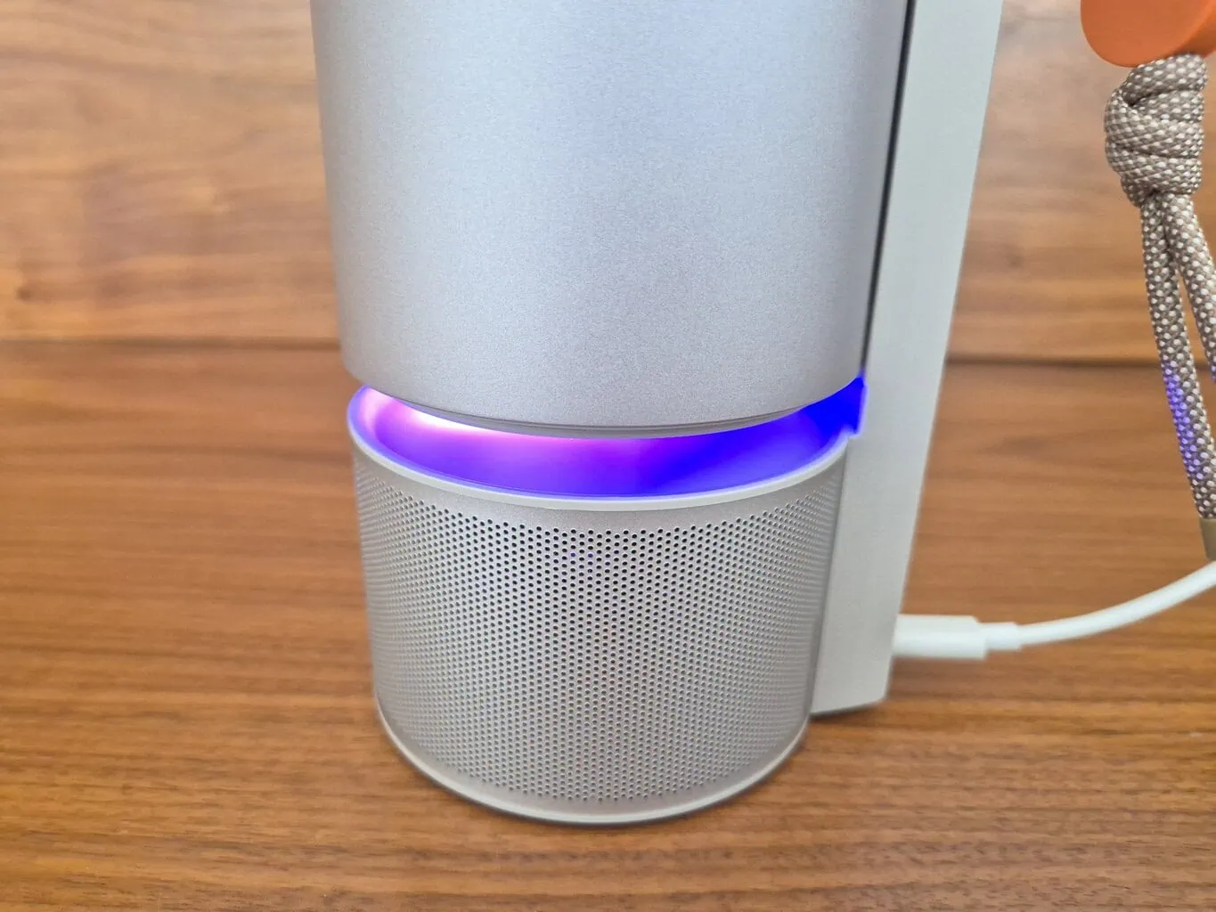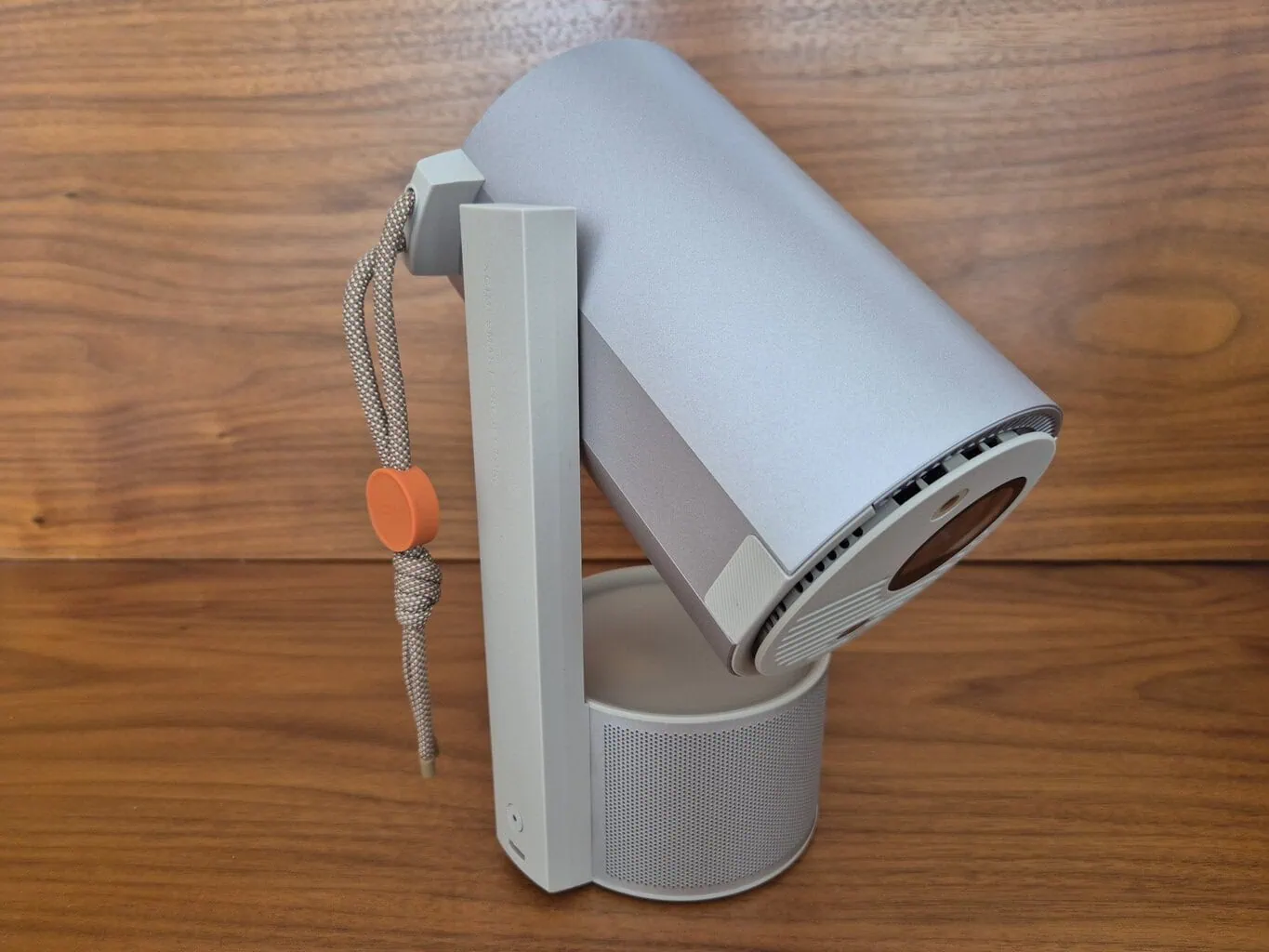 Projektor można również łatwo przekształcić w głośnik Bluetooth: wystarczy go obrócić do pozycji pionowej i nie wsunąć całkowicie do podstawy (co by go wyłączyło). Po chwili w tej pozycji aktywuje się interfejs Bluetooth oraz oświetlenie ambientowe. Może ono reagować i migać zgodnie z odtwarzaną muzyką. Nie jest to idealne rozwiązanie do intensywnego słuchania, ale w terenie może sprawić przyjemność.