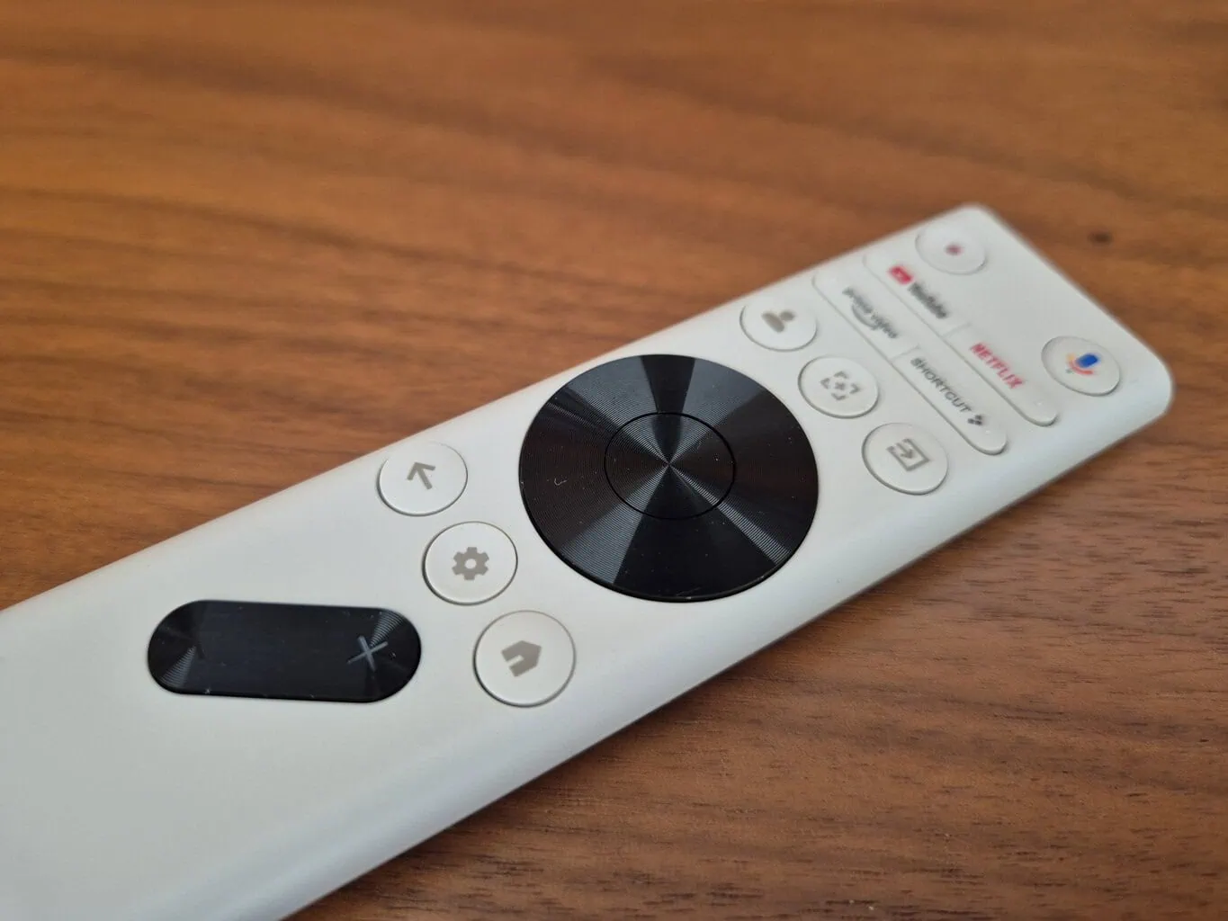 Na samym projektorze, oprócz przycisku włączania, nie znajdziesz żadnych innych elementów sterujących. Główną rolę odgrywa więc pilot, w którym dominuje segment kierunkowy z przyciskiem potwierdzającym. To są główne elementy do obsługi Google TV. Oprócz tego pilot zawiera przycisk do sterowania głosowego oraz uruchamiania trzech platform wideo: YouTube, Netflix i Prime Video.