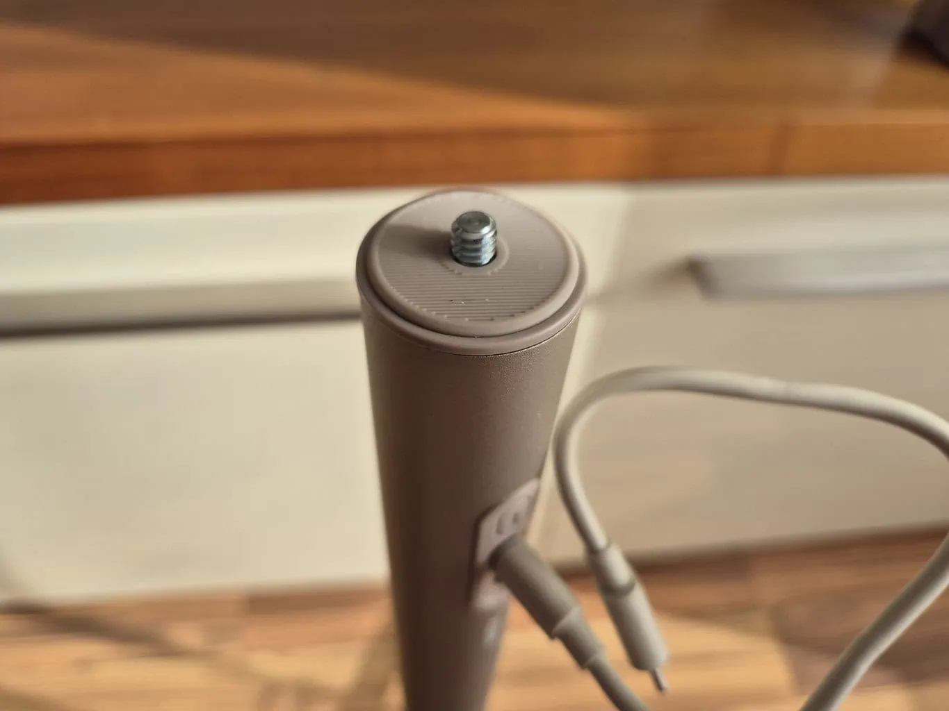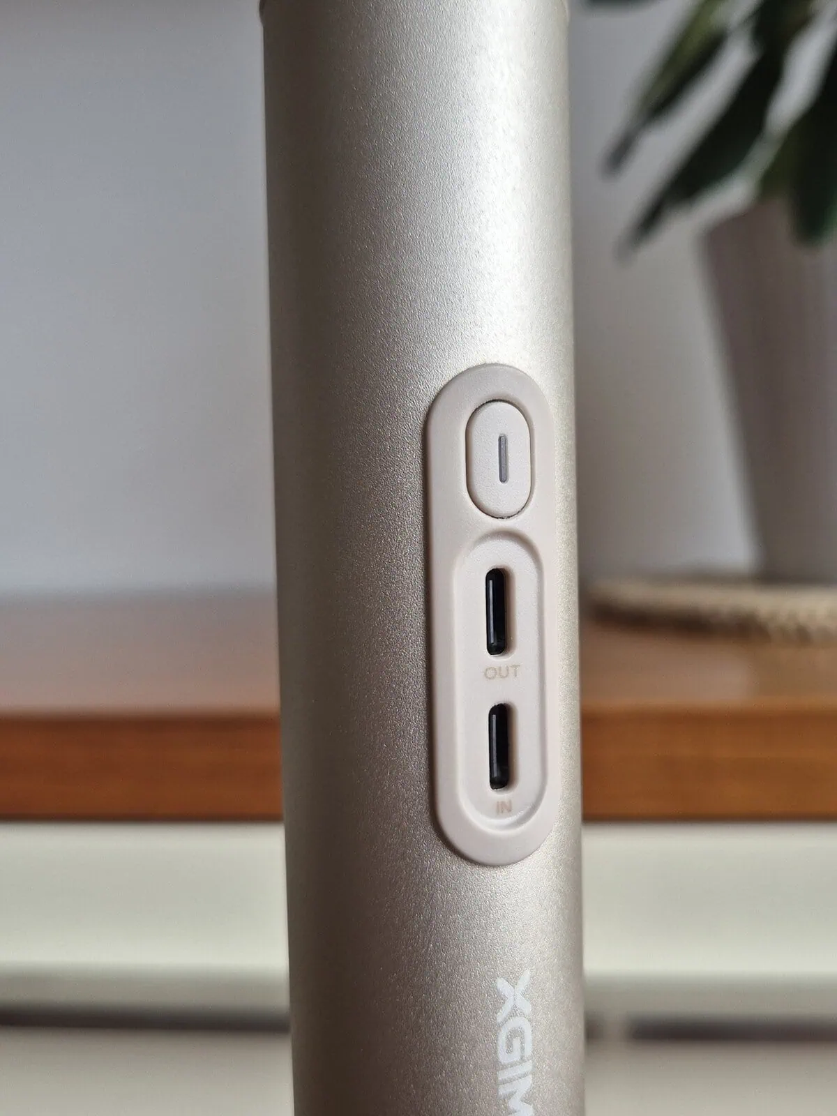 Stojak ma dwa złącza USB-C, z czego jedno służy do wejścia, a drugie do wyjścia, czyli zasilania projektora. Do wejścia podłączony jest zasilacz, który w pierwszej kolejności ładuje powerbank, który jest jednak przelotowy, więc podczas ładowania jednocześnie zasila projektor. W przypadku odłączenia zasilacza od powerbanku, zasilanie przełącza się na baterię i można kontynuować projekcję bez przerwy.