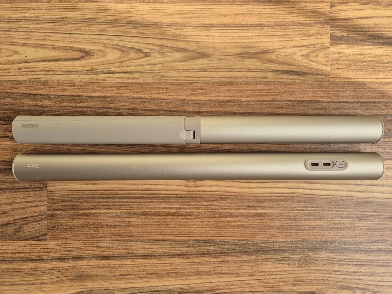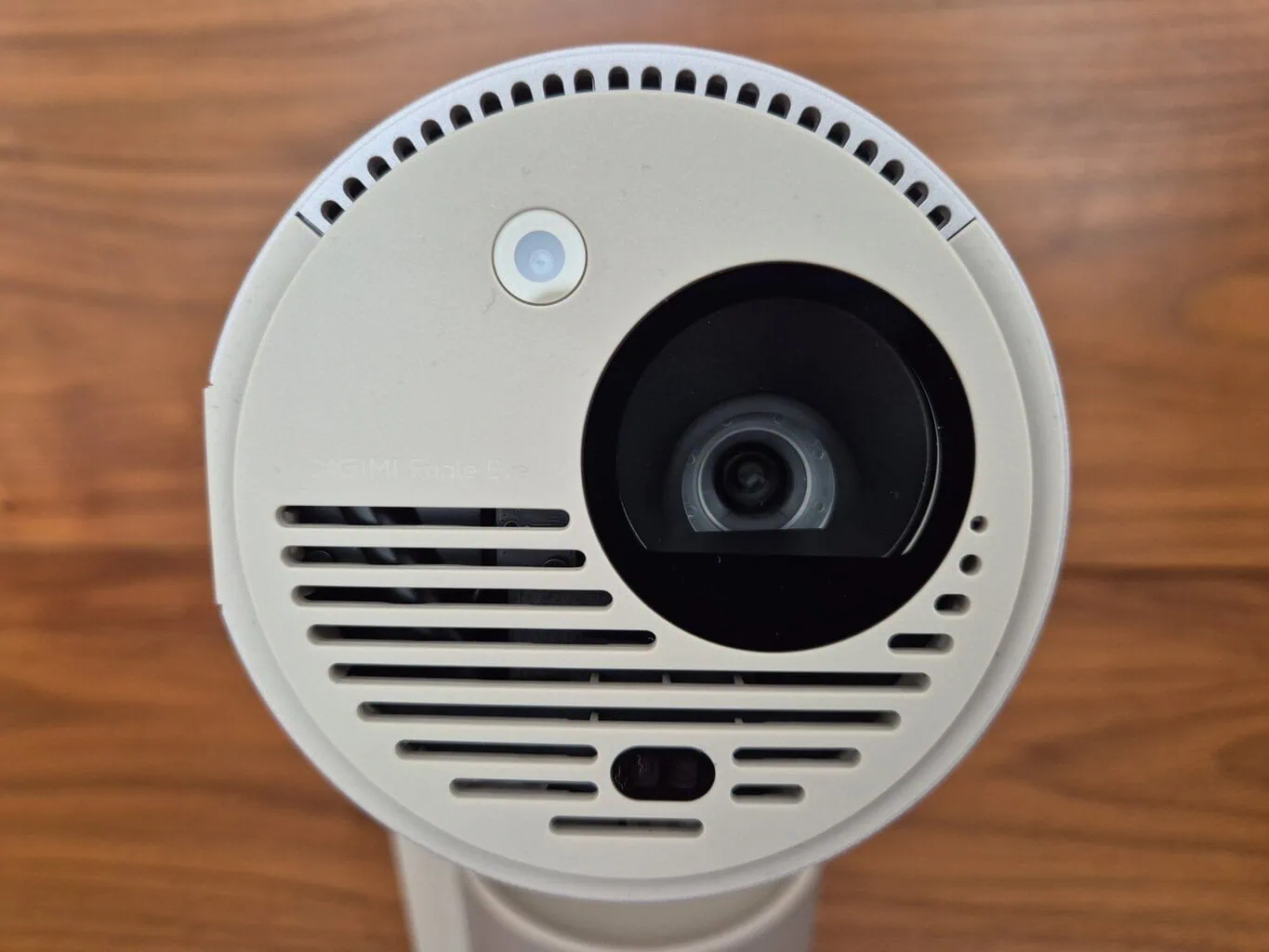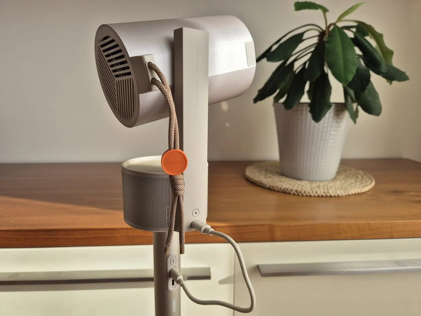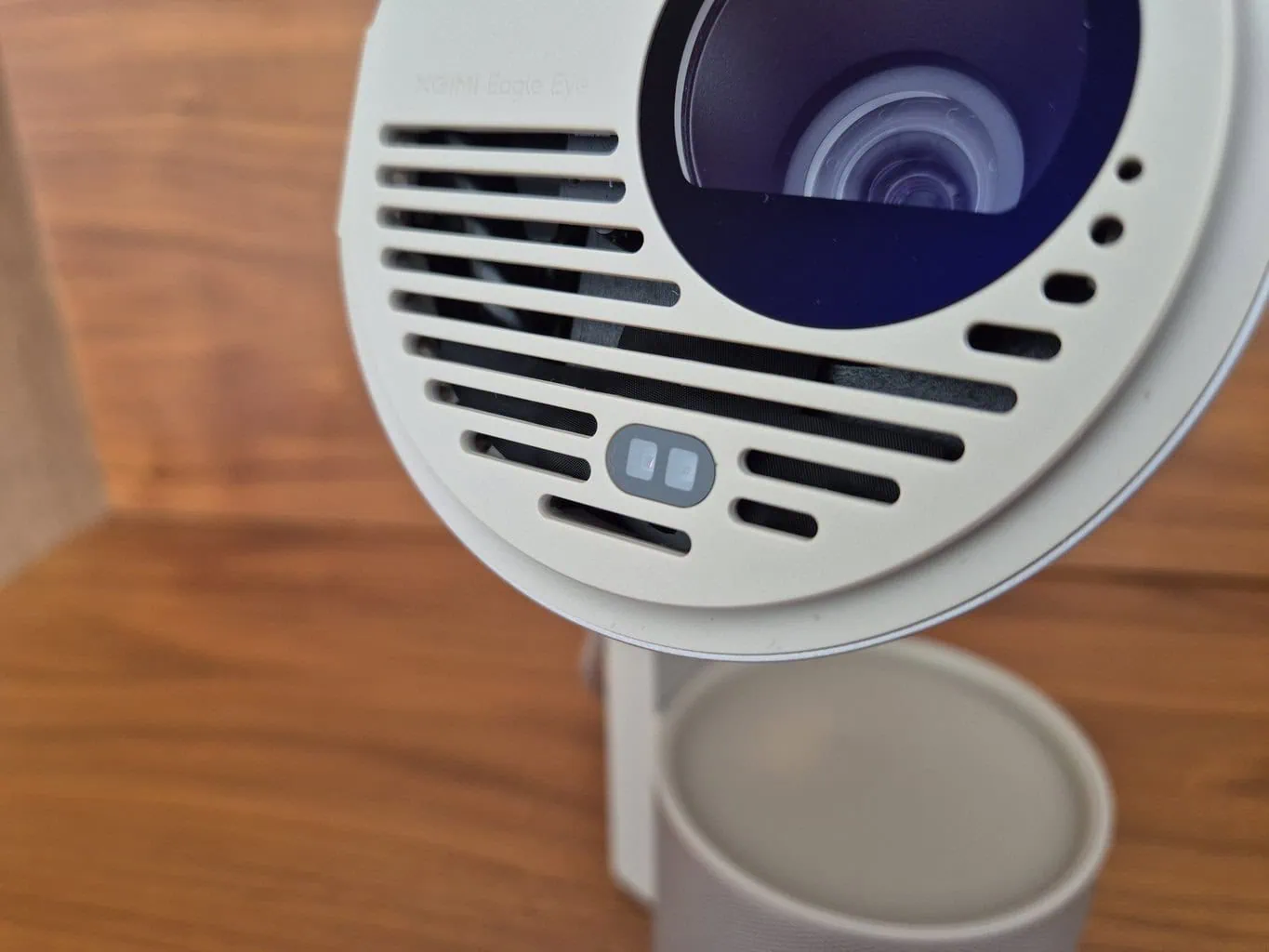 Nawet w przypadku samego projektora XGIMI wprowadziło kilka innowacyjnych drobnostek, które cieszą podczas użytkowania. Przede wszystkim jest to ogólna ergonomia projektora, który jest podzielony na dwie części – dolną podstawę z wbudowanym głośnikiem i górną główną część. Oba segmenty łączy noga z przegubem, na którym obraca się część projektorowa. Przy jej rozłożeniu projektor uruchamia się automatycznie.