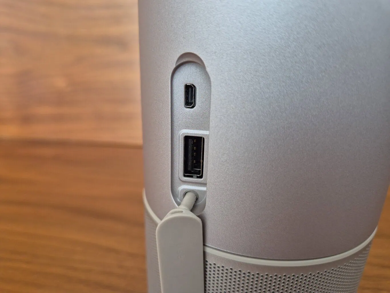 Projektor XGIMI MoGo 3 Pro posiada trzy złącza, z których dwa znajdują się na obudowie projektora za gumową zaślepką. Znajduje się tam microHDMI do podłączenia zewnętrznego źródła obrazu oraz standardowe USB z interfejsem 2.0.
