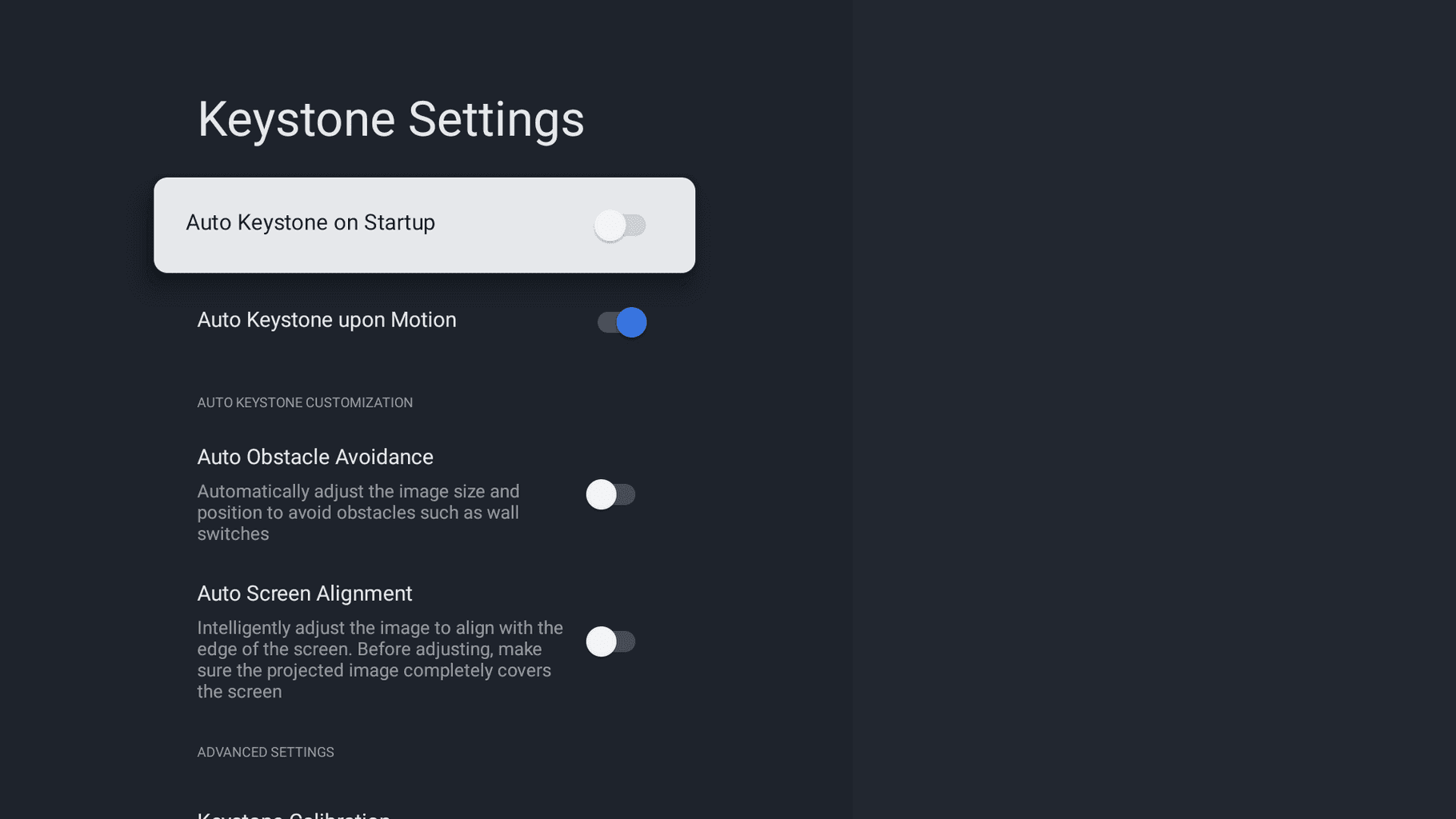 Również zalecam w ustawieniach aktywować korekcję trapezu po każdym uruchomieniu projektora. Nie zawsze projektor może od razu zauważyć zmianę położenia, w ten sposób zawsze dostosuje obraz.
