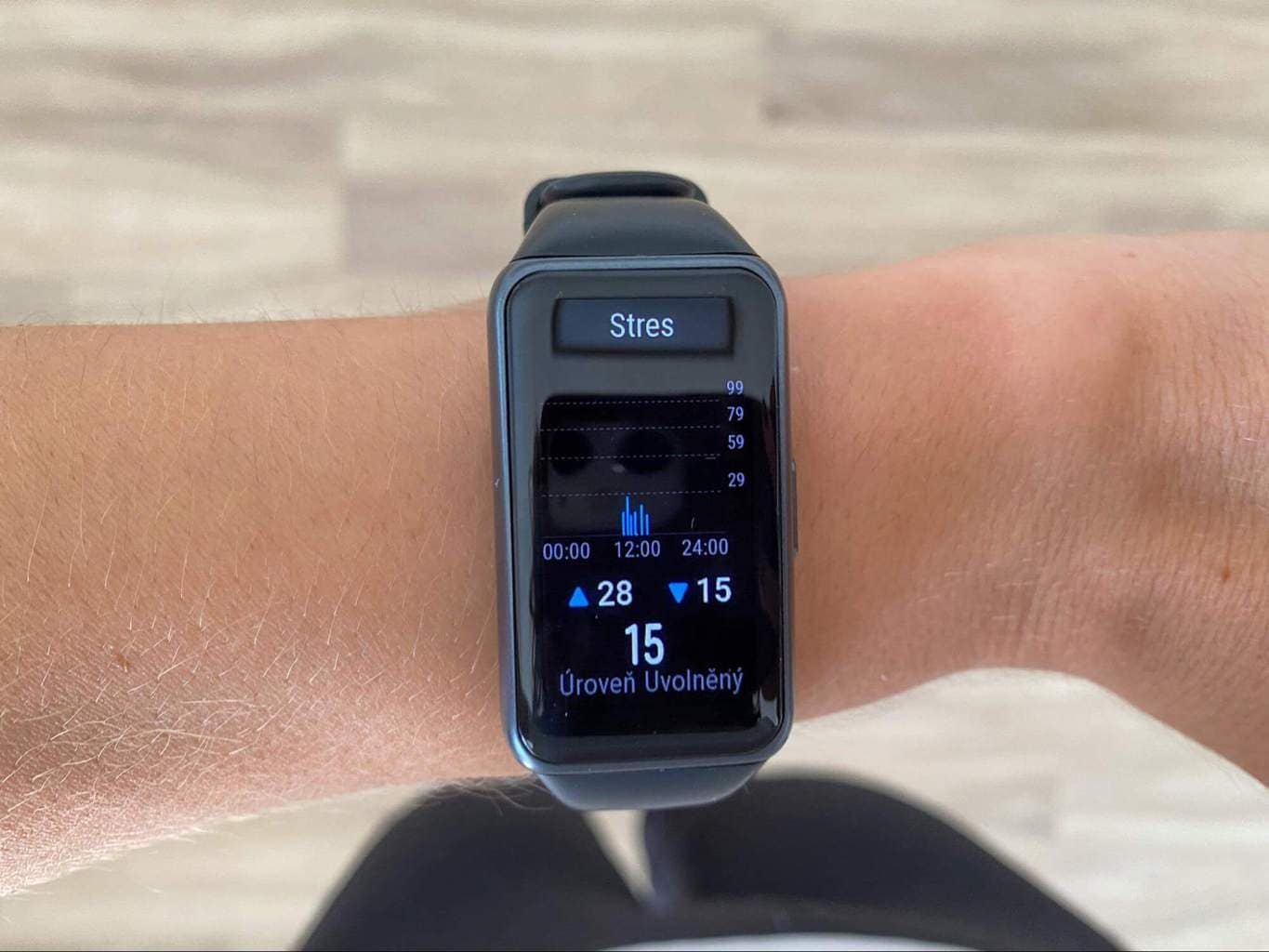 Huawei Band 6 może również mierzyć poziom aktualnego obciążenia stresem. Najpierw należy włączyć automatyczny test stresu w aplikacji mobilnej, a następnie opaska stale mierzy poziom stresu (na podstawie wahań tętna). Dzisiejsze dane zostaną wyświetlone w bransoletce, a następnie można je przeglądać wstecz w aplikacji mobilnej, która zawiera kilka łatwych do odczytania wykresów.