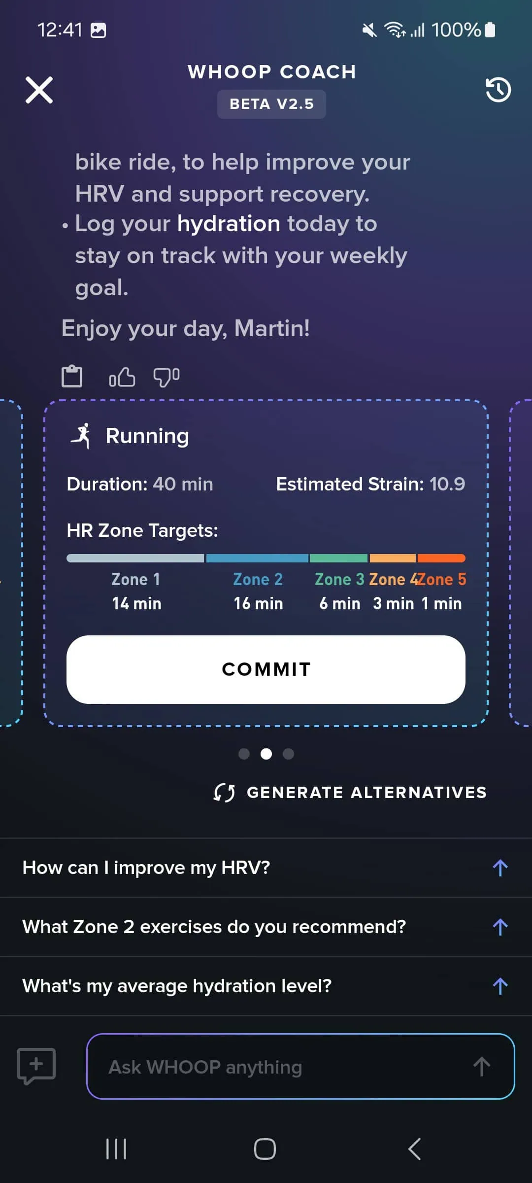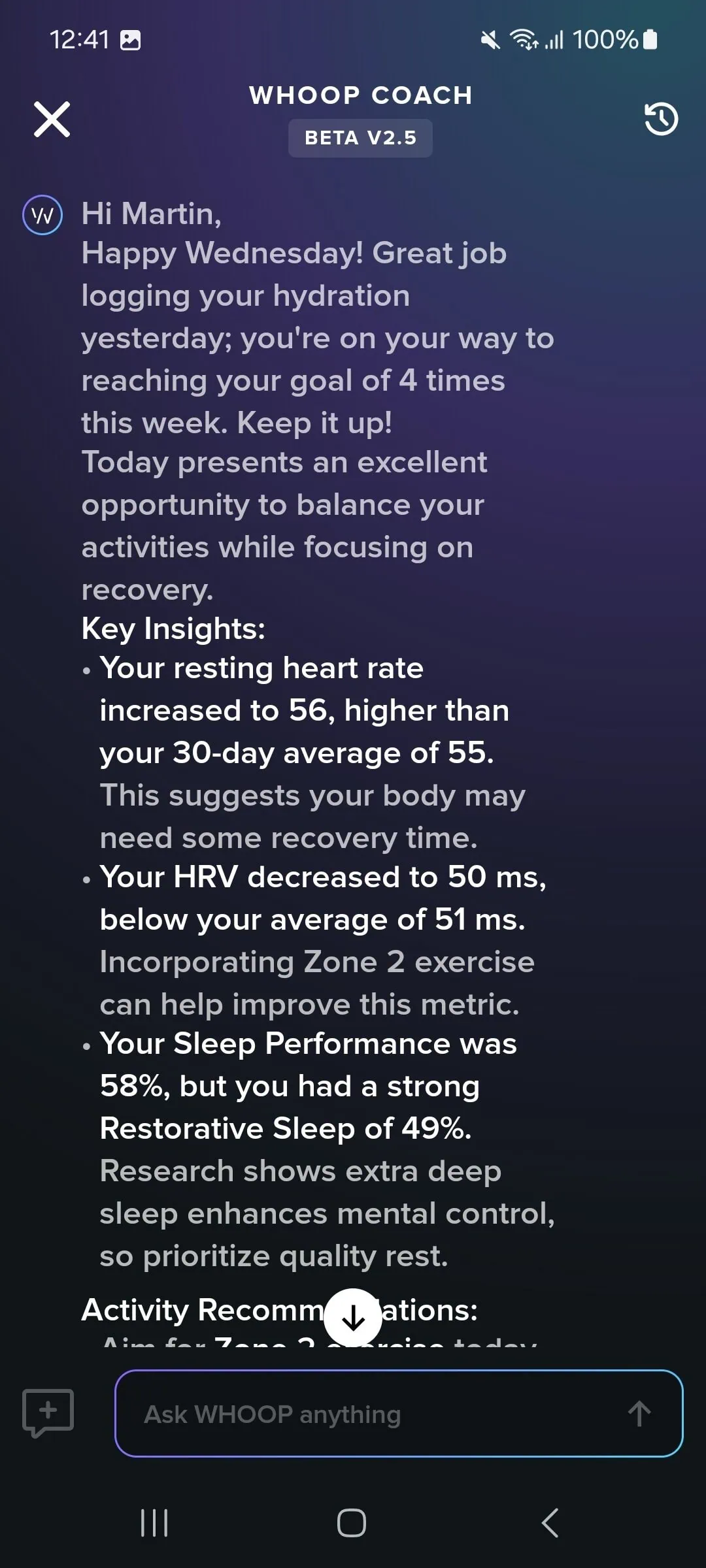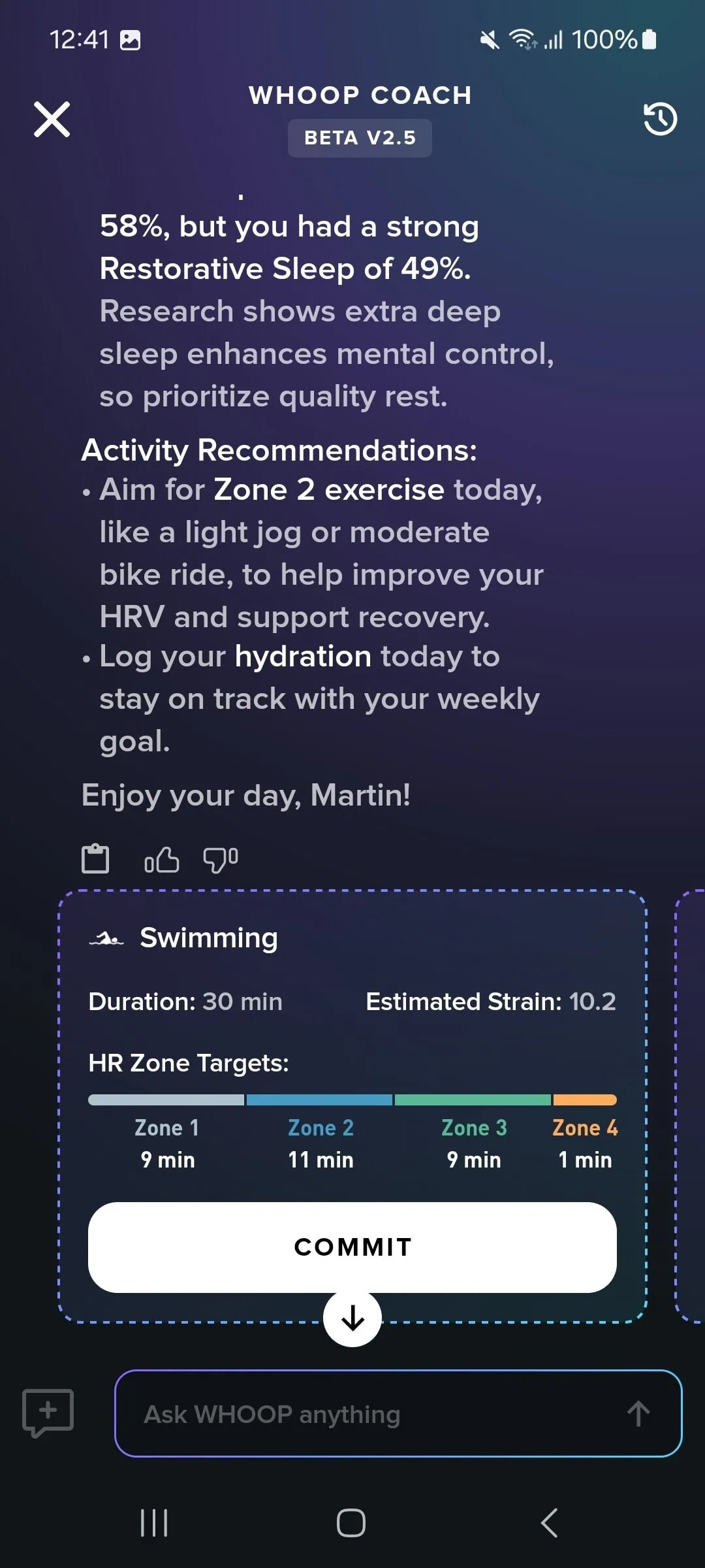 WHOOP Coach służy także do szybkiego uzyskiwania dodatkowych informacji, które w innym przypadku musiałbyś żmudnie wyszukiwać w zakamarkach aplikacji. Asystenta możesz zapytać o swój aktualny stan, rekomendacje, poziom zmęczenia czy stresu, a także o porównanie z innymi użytkownikami. Asystent odpowiada również na pytania typu „Czy jestem chory?” lub „Dlaczego dziś czuję się zmęczony?”.