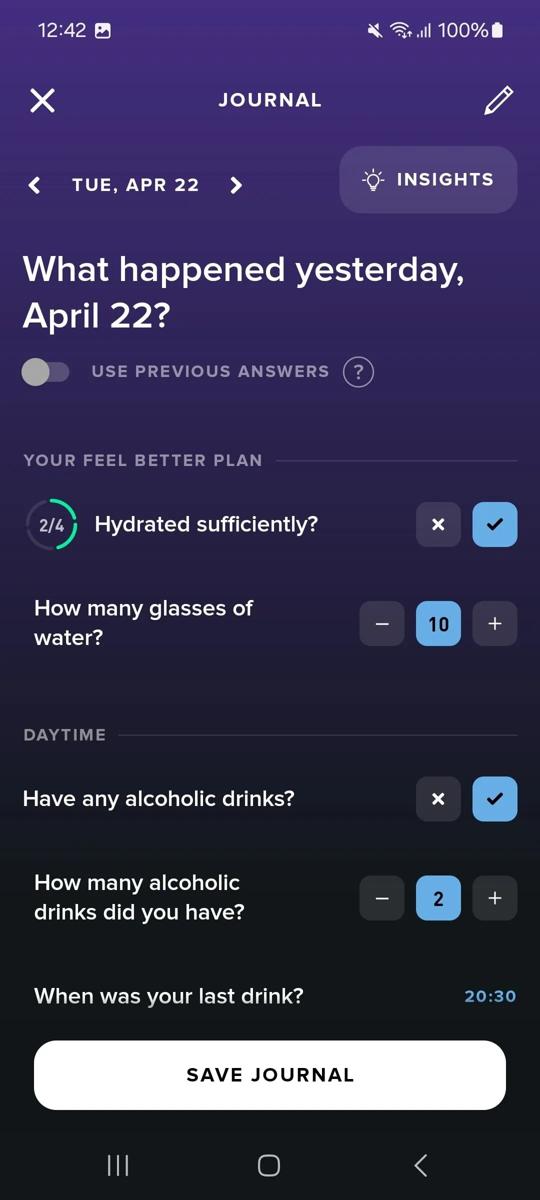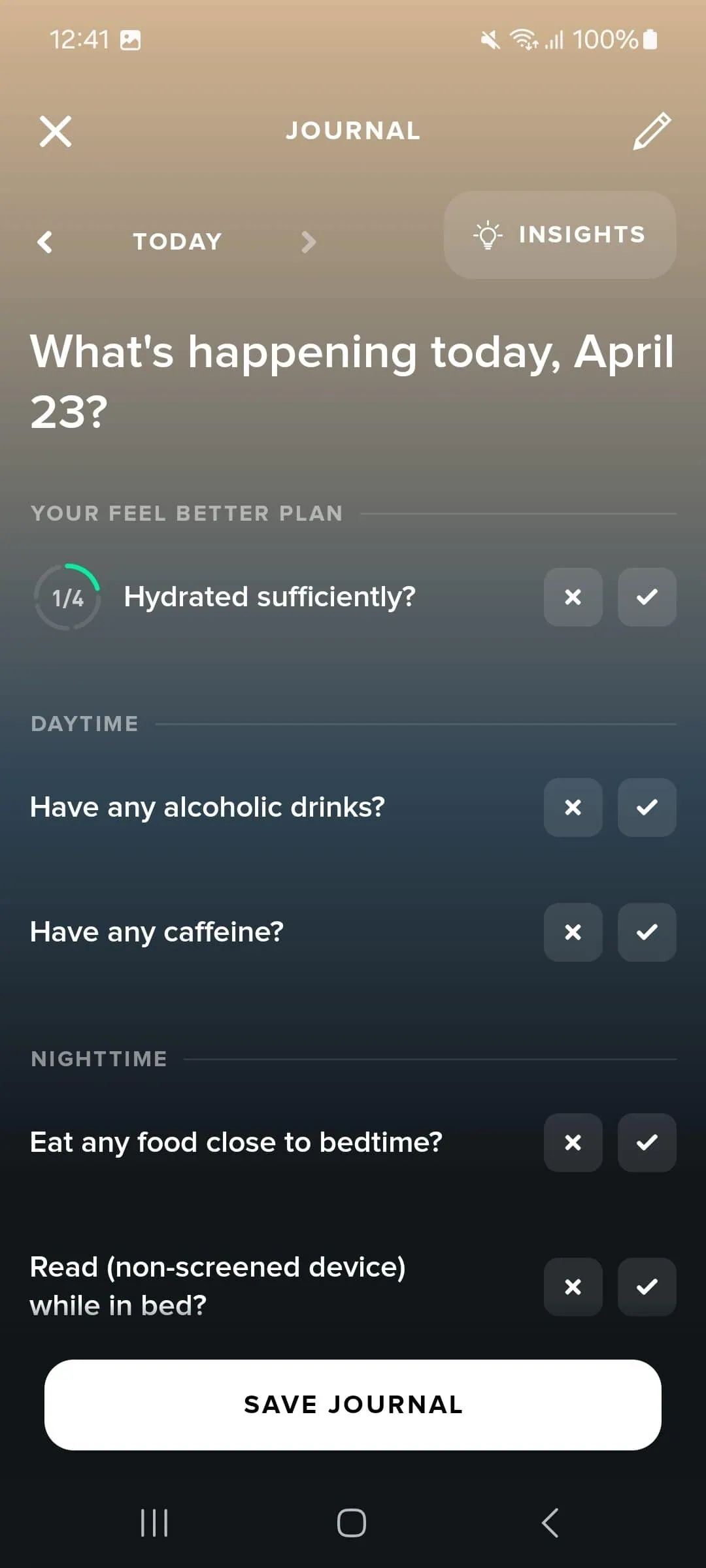Dziennik dotyczy Twoich codziennych nawyków, które wpływają na jakość snu. Możesz zapisywać spożycie alkoholu, kofeiny, posiłków lub czytanie czegokolwiek poza ekranami. Na podstawie wprowadzonych danych oraz długoterminowej analizy jakości snu otrzymasz podsumowanie, czy te nawyki są korzystne dla Twojego zdrowia (Help) czy szkodliwe (Hurt).