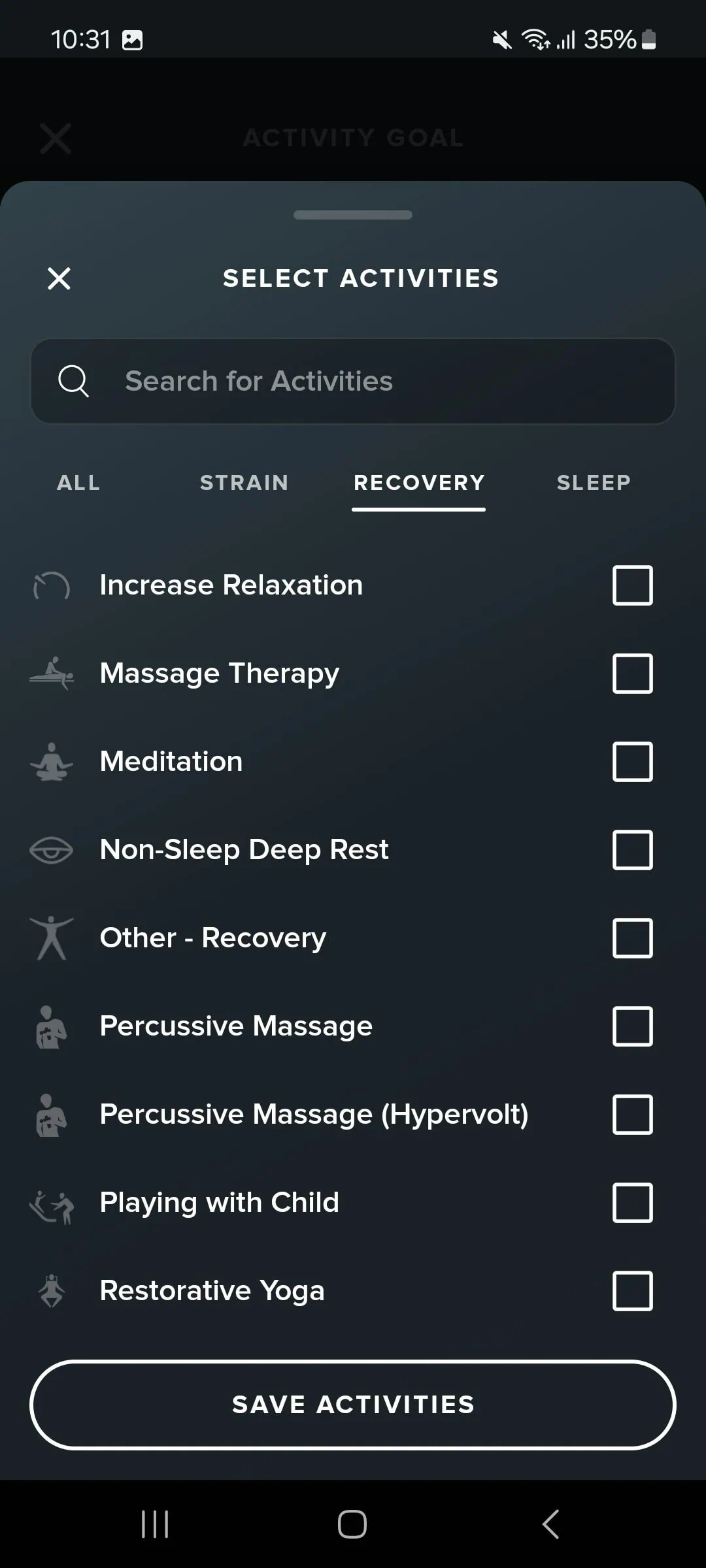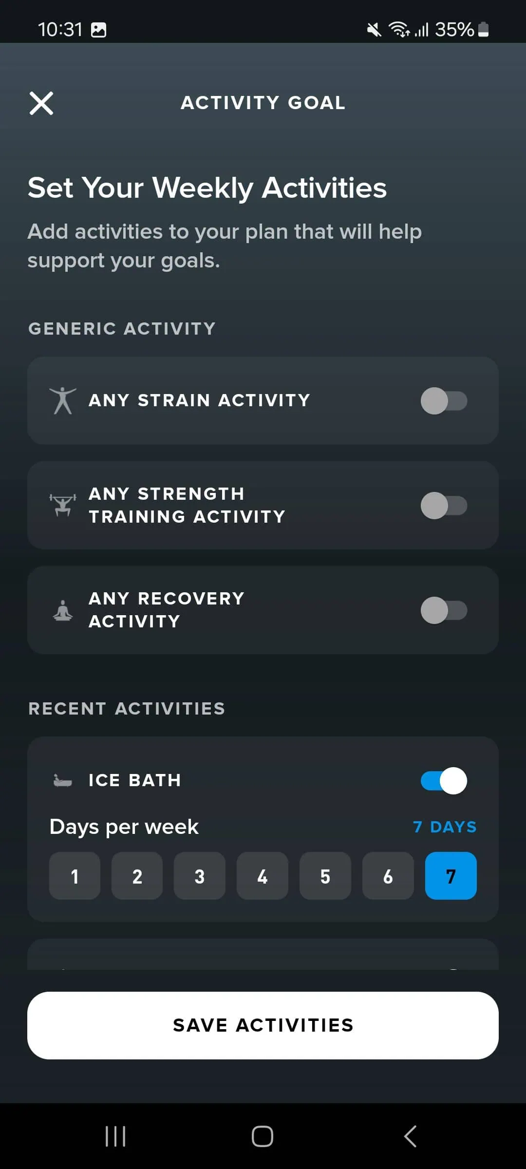 Activities – jeśli masz na oku aktywności sportowe lub rekreacyjne, które chciałbyś wprowadzić do swojej rutyny, to idealny sposób, by to zrobić. Do wyboru masz pełne spektrum aktywności oraz możliwość określenia liczby dni, które chcesz im poświęcić. Możesz też wybrać ogólne cele (dowolna aktywność ruchowa, siłowa lub relaksacyjna).