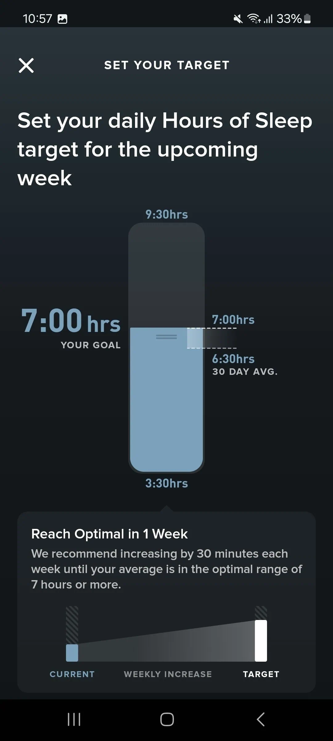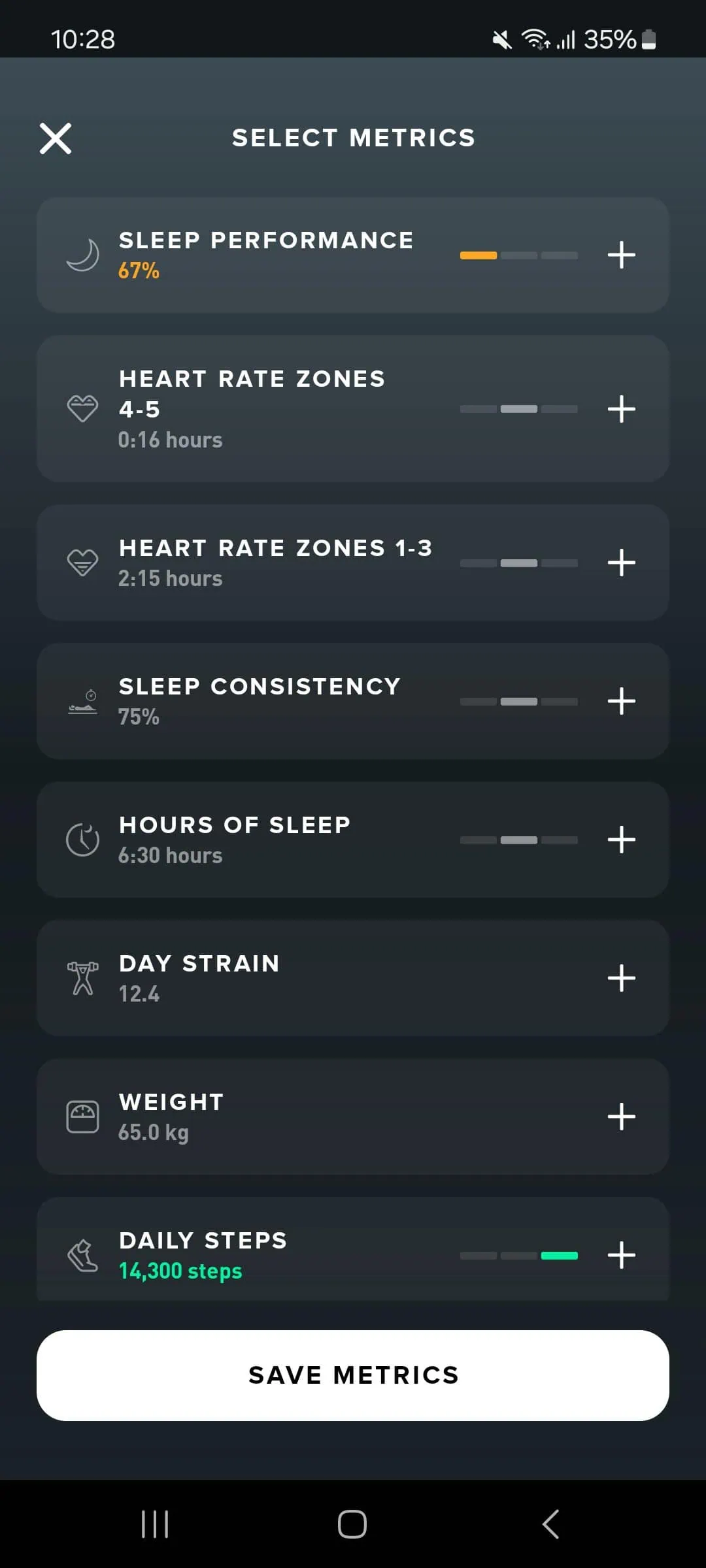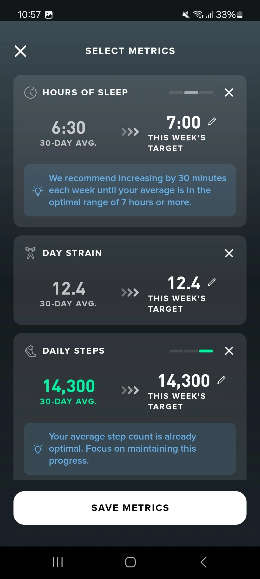 Metrics – to główne monitorowane parametry (wynik snu, kroki, dzienne obciążenie). Wartość docelowa może być wyliczona przez algorytm lub dowolna, którą sam wybierzesz.