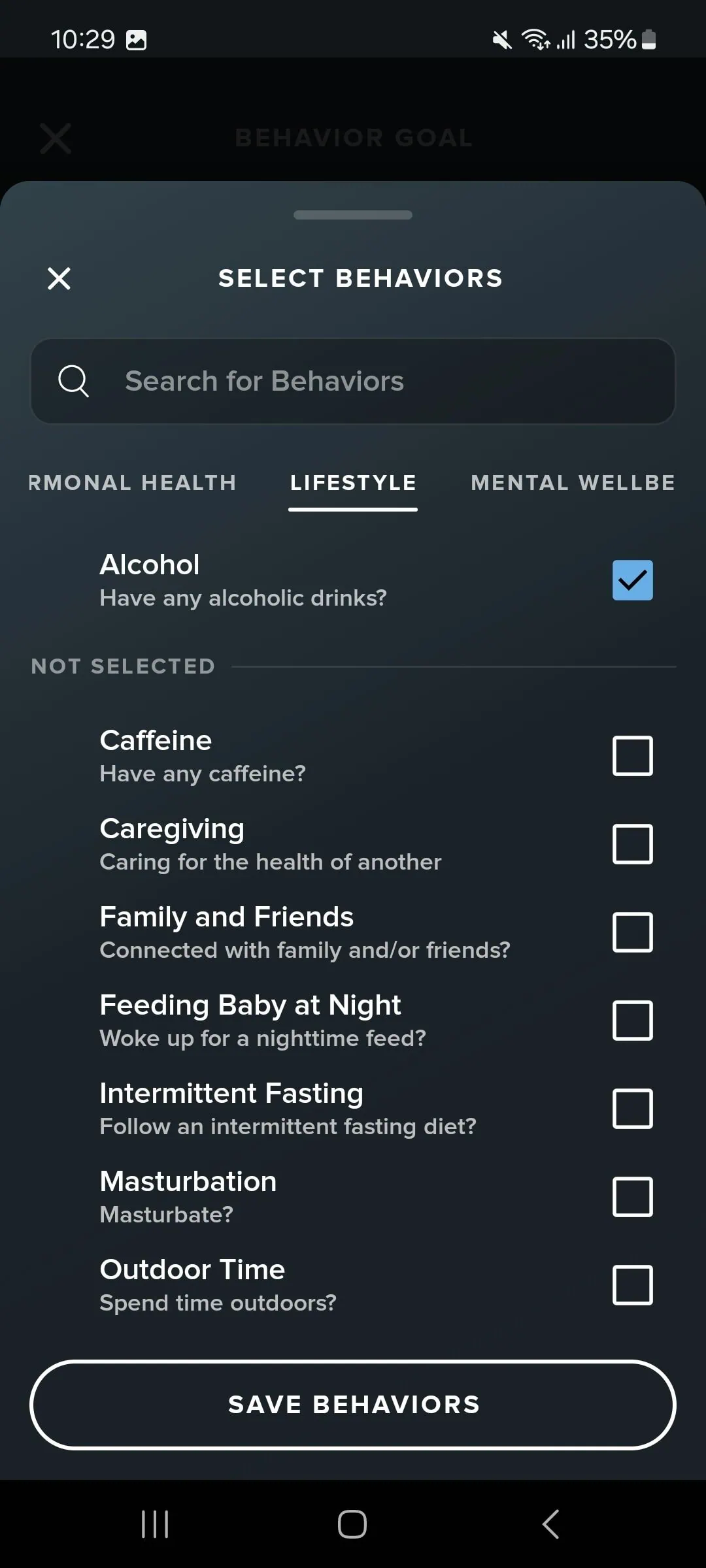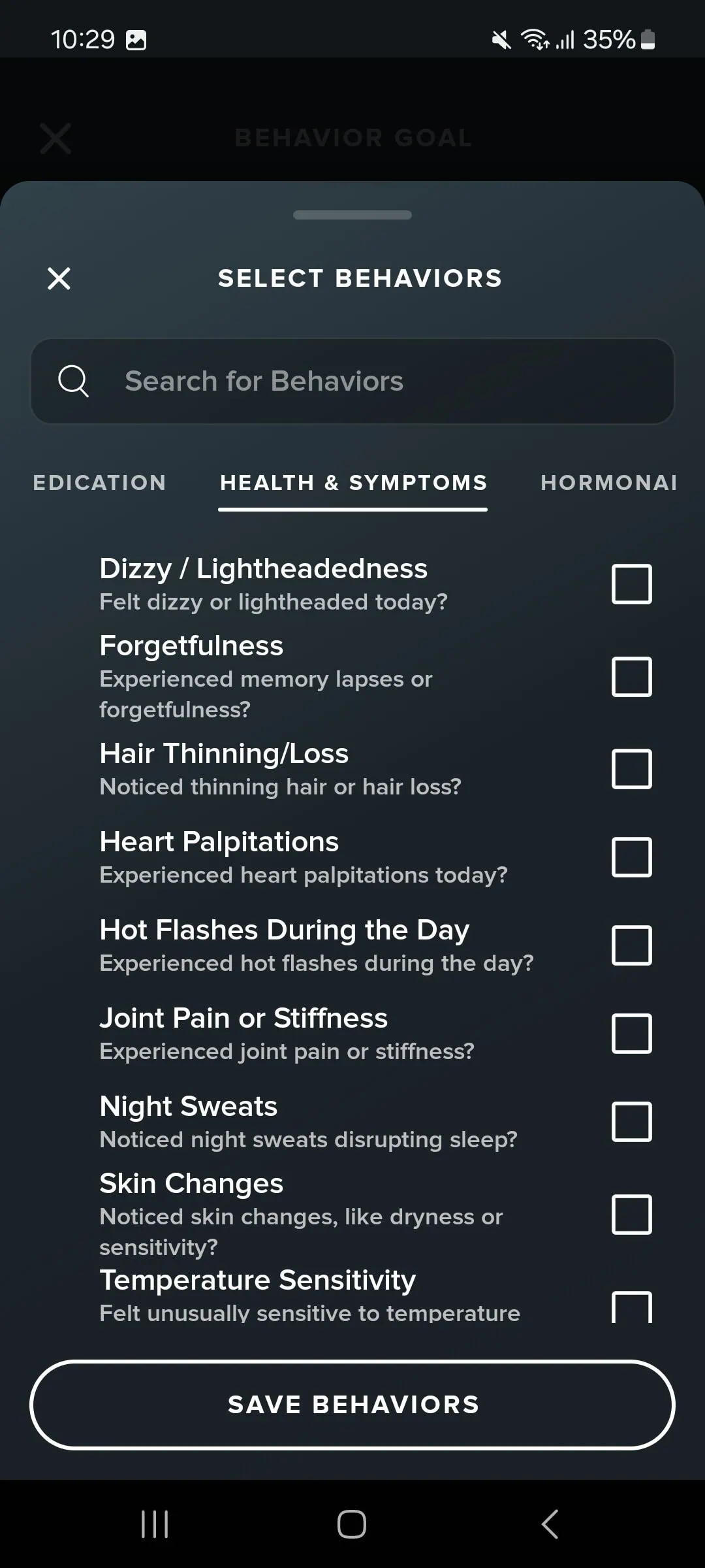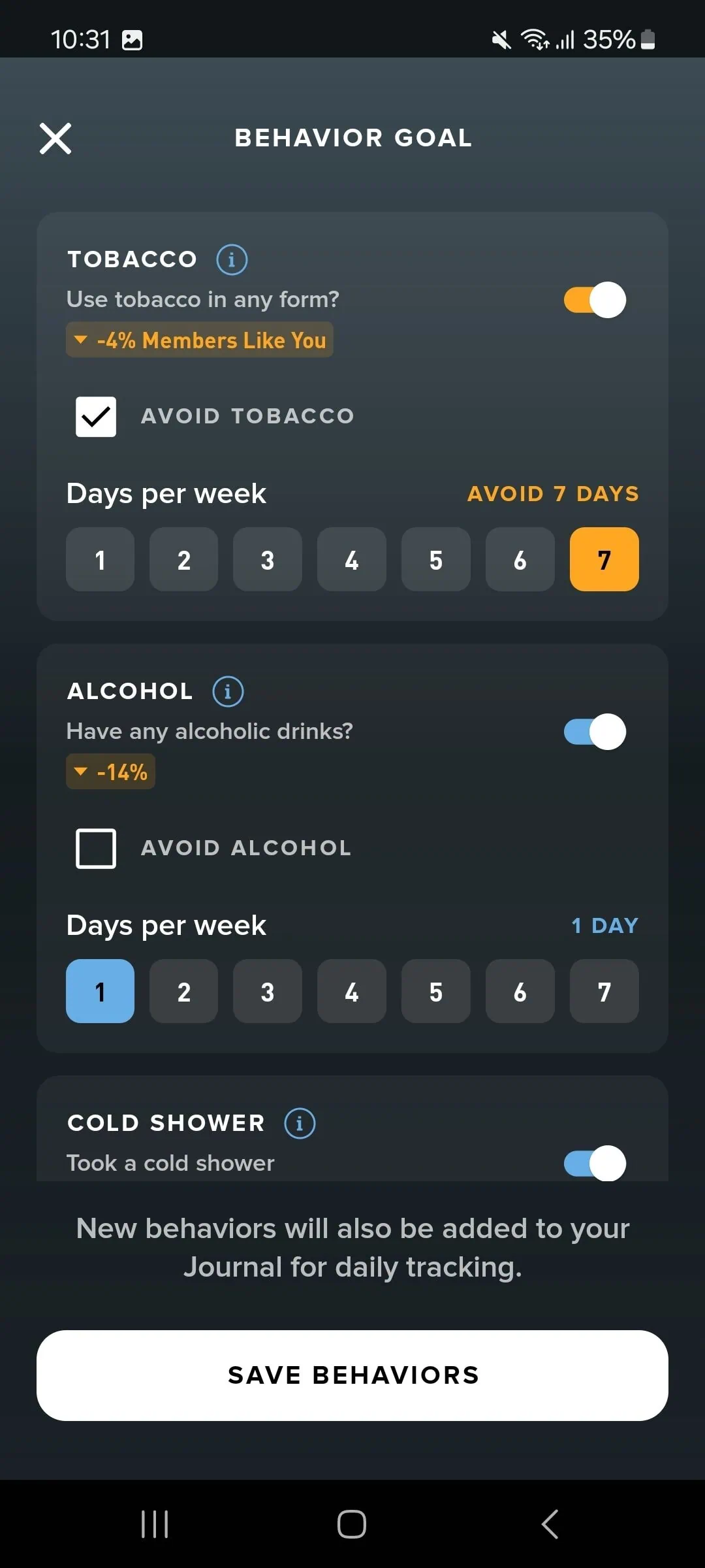 Behaviors – to nawyki, zachowania lub różne symptomy związane z Twoim zdrowiem. Przykładem może być palenie tytoniu, nocne poty, stosowanie antykoncepcji, okazywanie wdzięczności, nawyki żywieniowe i wiele innych. Liczba dostępnych opcji naprawdę mnie zaskoczyła. Każde zachowanie jest opisane pod kątem wpływu na zdrowie lub jego przyczyn. W ustawieniach możesz wybrać, czy chcesz się danego zachowania pozbyć, czy je wspierać.