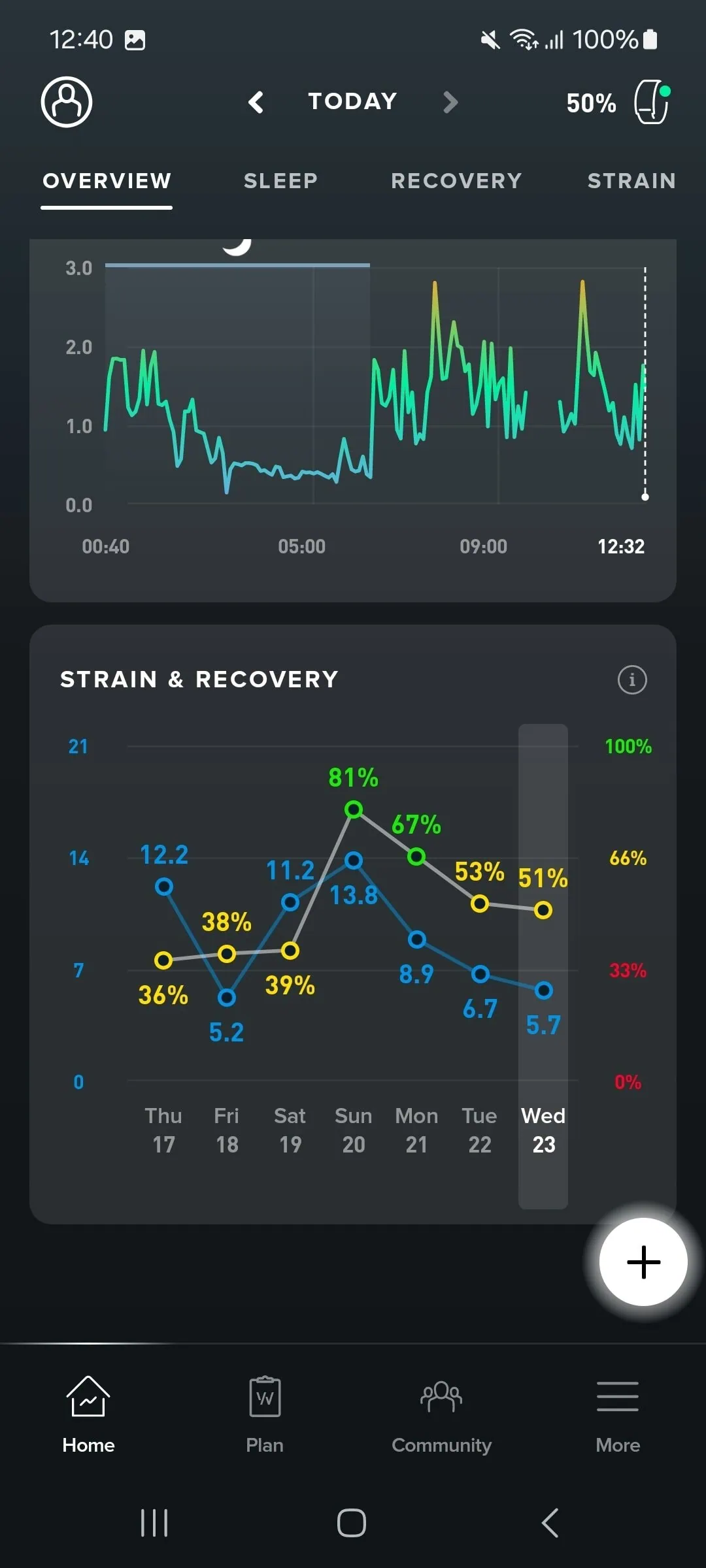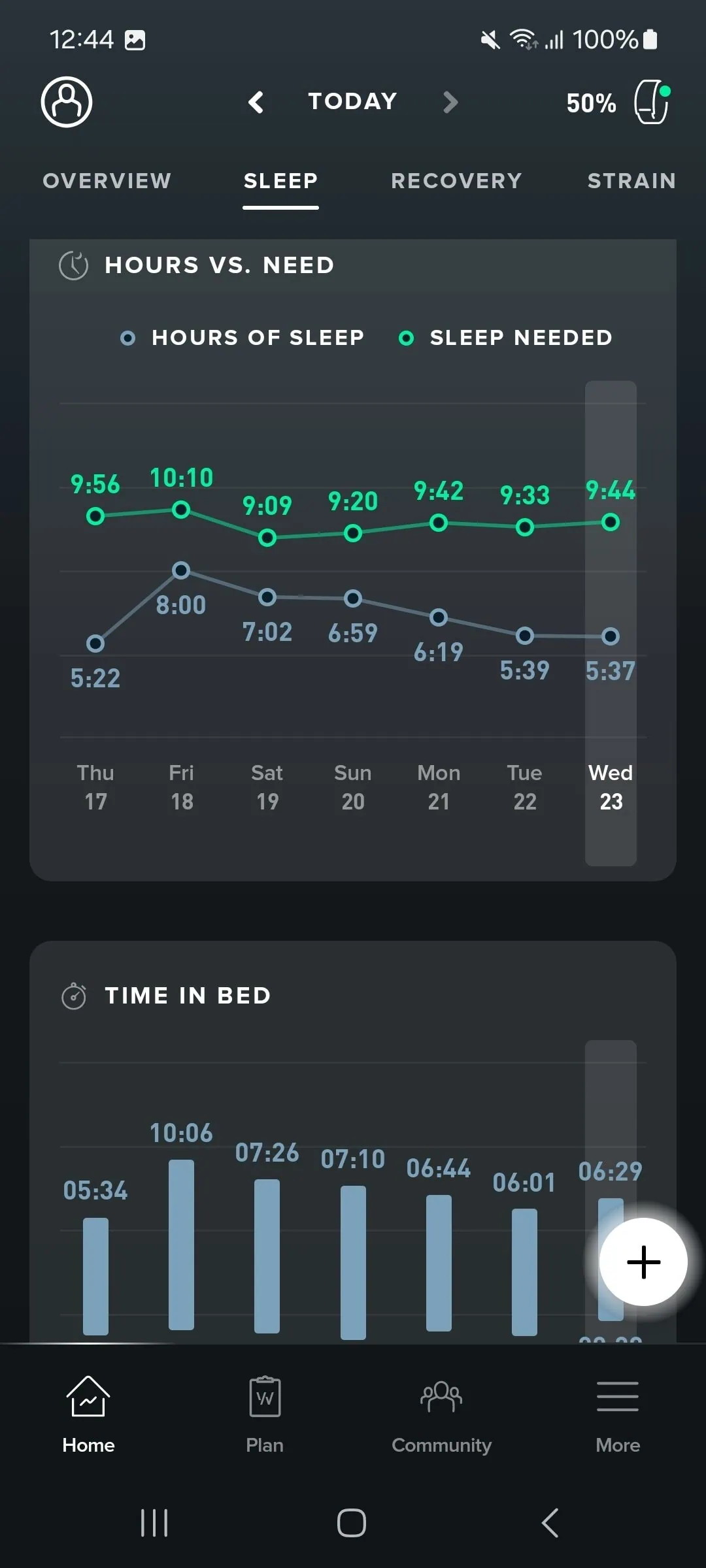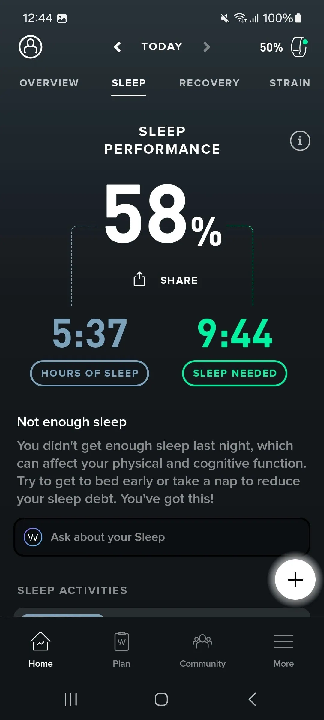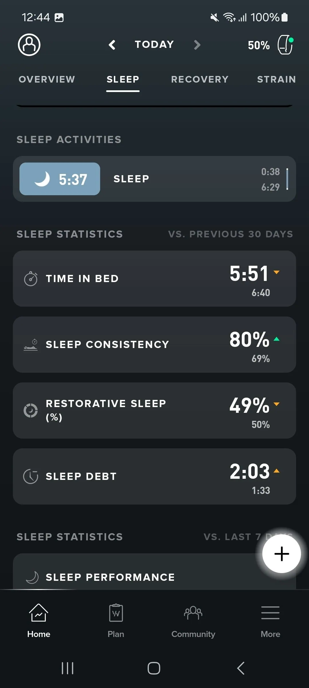 Ogólnie oceniam monitorowanie snu bardzo pozytywnie. WHOOP potrafił oszacować czas pobudki z maksymalnym odchyleniem do pięciu minut. Całkowity czas snu zazwyczaj odpowiadał rzeczywistości. Dług snu zmieniał się adekwatnie do długości mojego snu. Krótszy i mniej jakościowy sen zwiększał dług, natomiast solidny nocny odpoczynek go zmniejszał. Ocena procentowa snu niemal zawsze pokrywała się z moimi odczuciami w ciągu dnia.