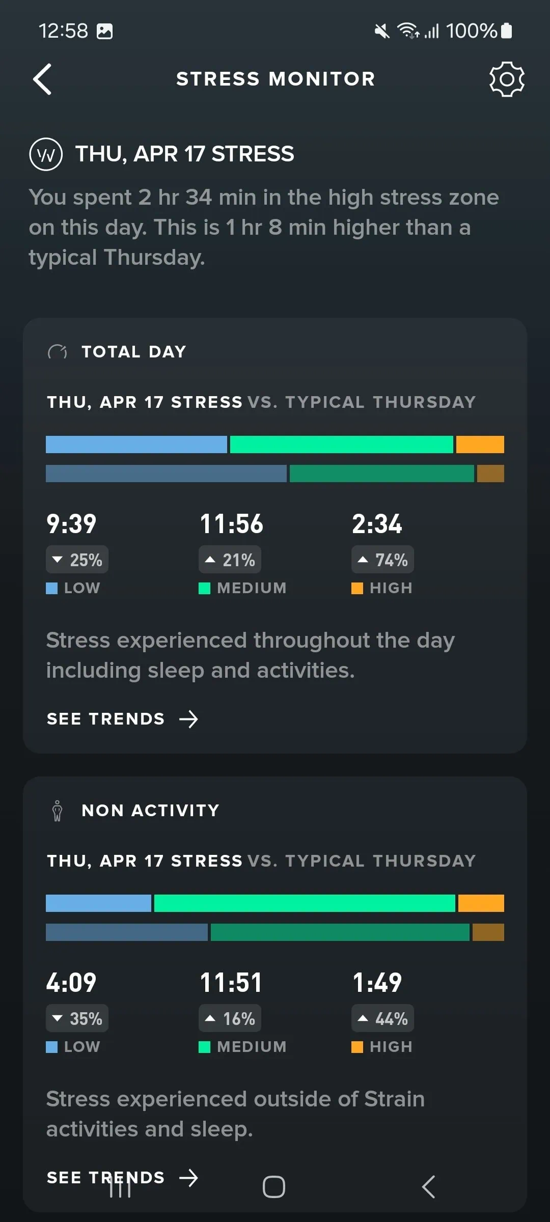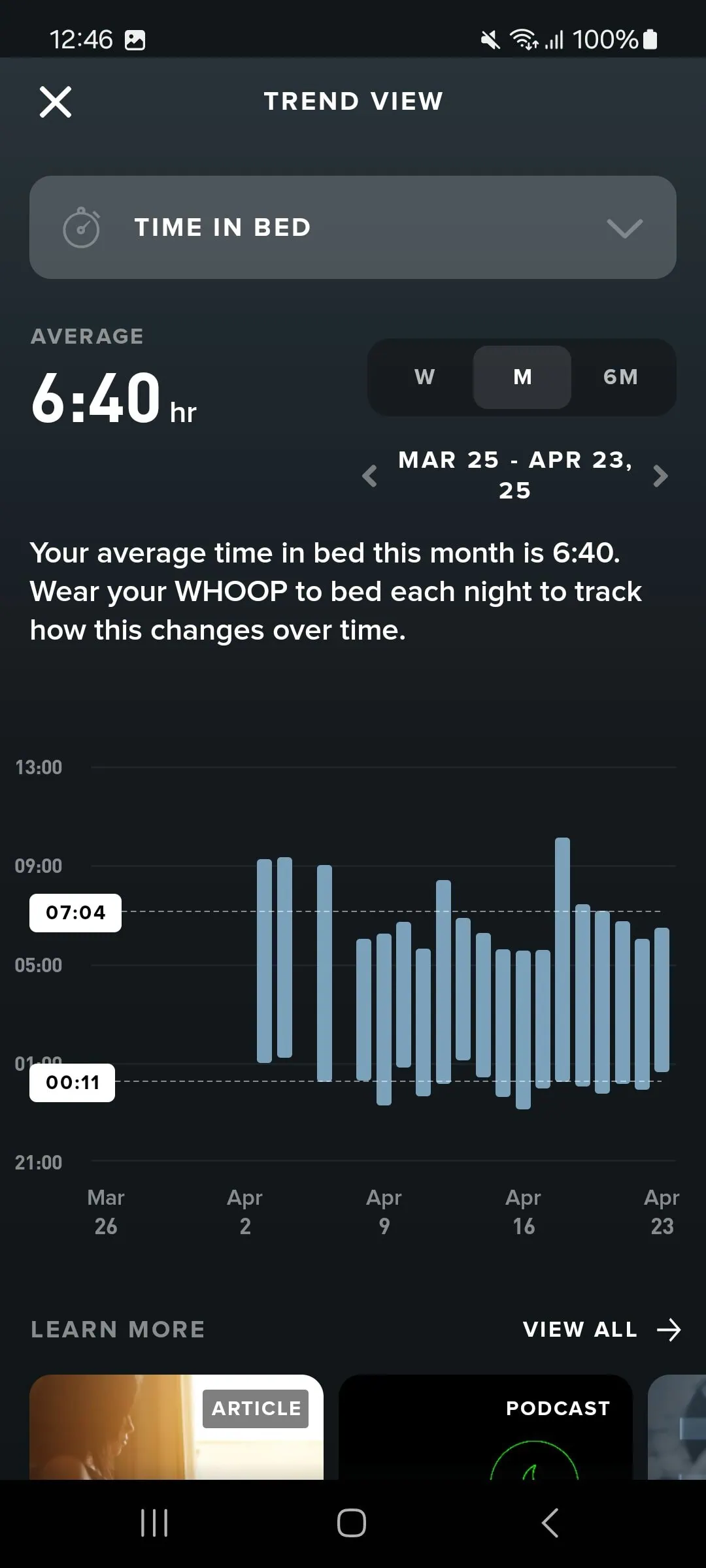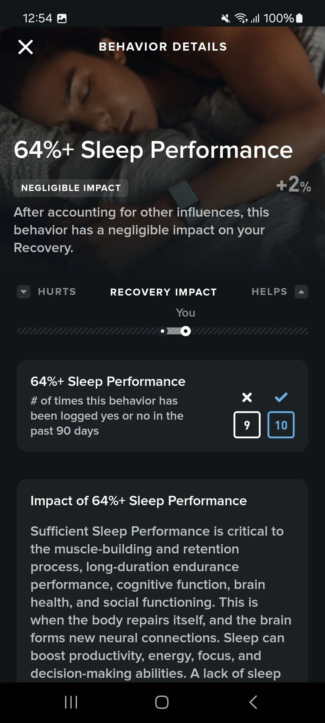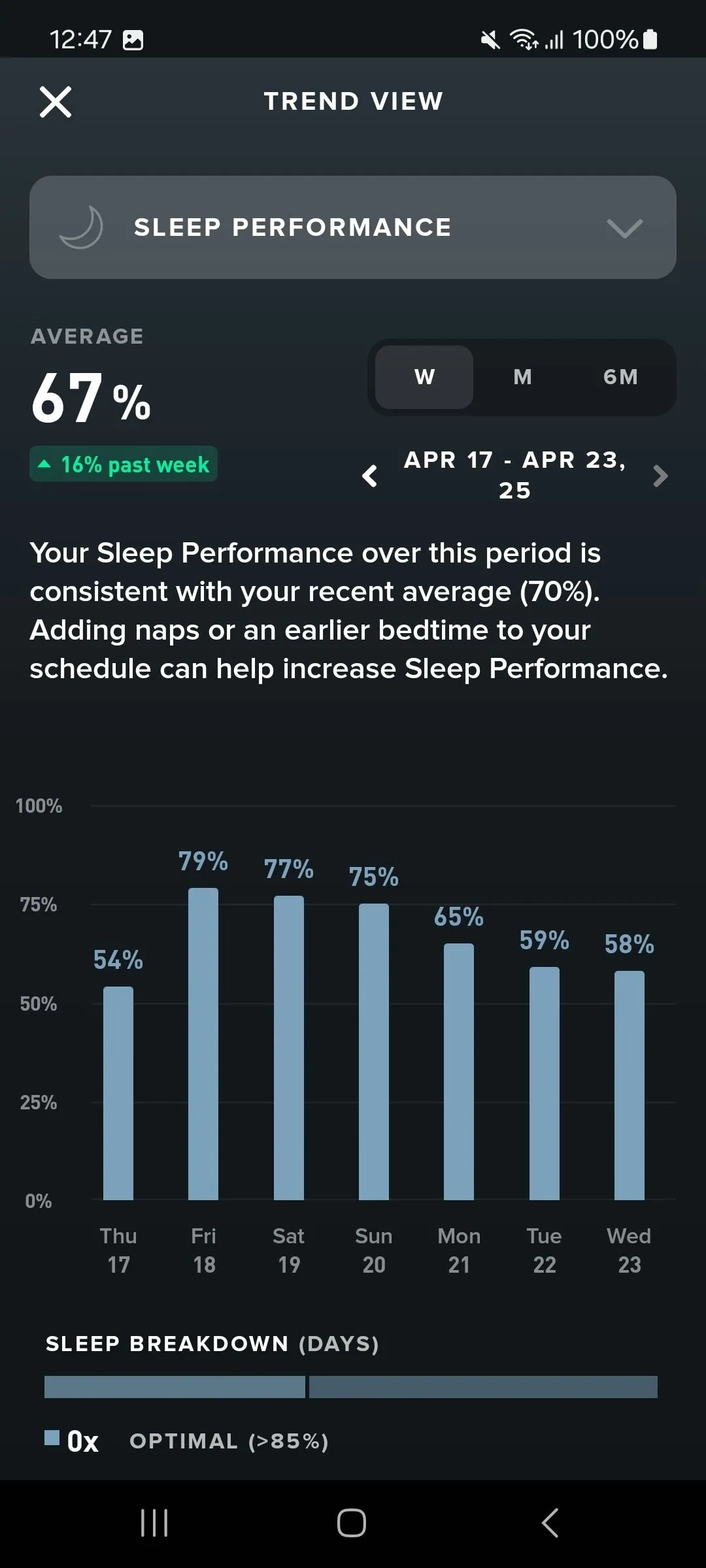 Ogólnie oceniam monitorowanie snu bardzo pozytywnie. WHOOP potrafił oszacować czas pobudki z maksymalnym odchyleniem do pięciu minut. Całkowity czas snu zazwyczaj odpowiadał rzeczywistości. Dług snu zmieniał się adekwatnie do długości mojego snu. Krótszy i mniej jakościowy sen zwiększał dług, natomiast solidny nocny odpoczynek go zmniejszał. Ocena procentowa snu niemal zawsze pokrywała się z moimi odczuciami w ciągu dnia.