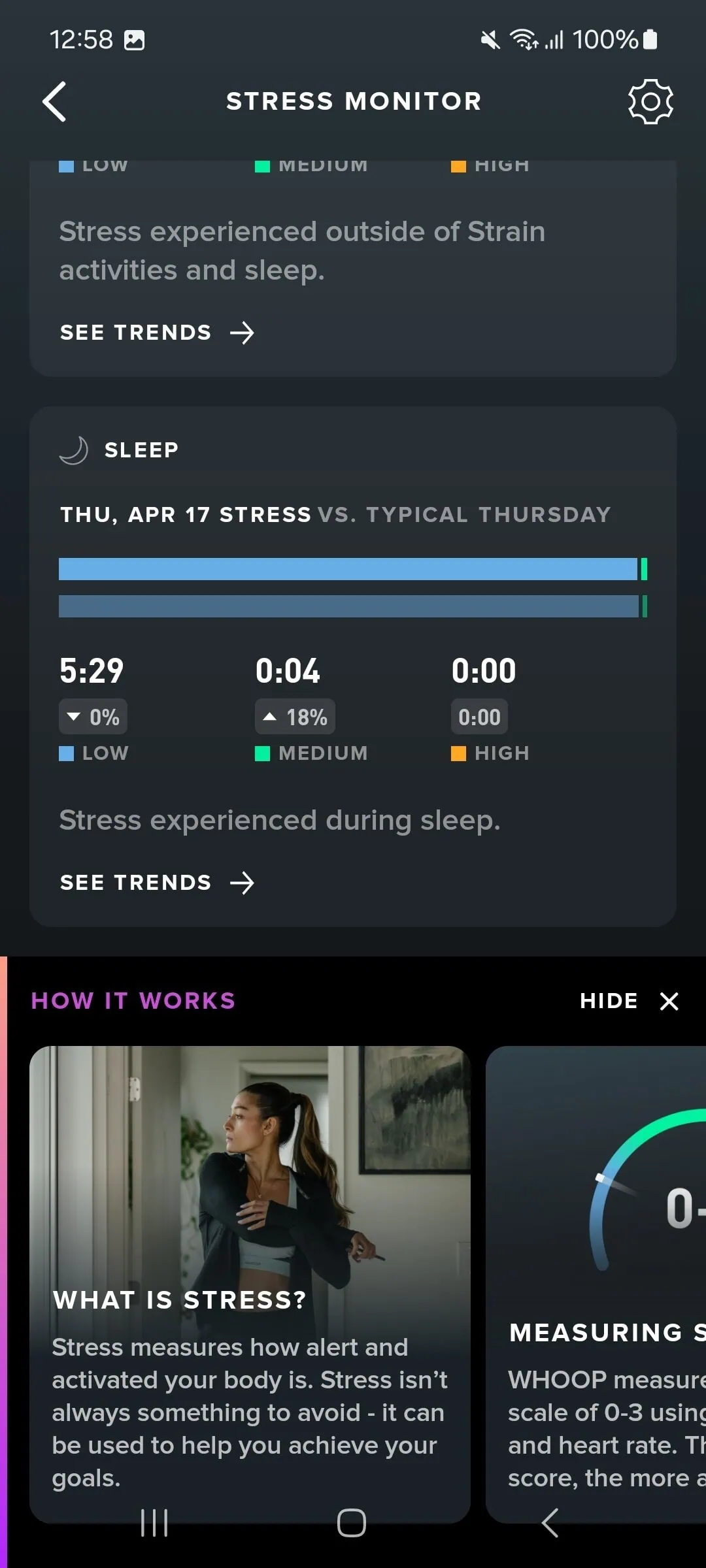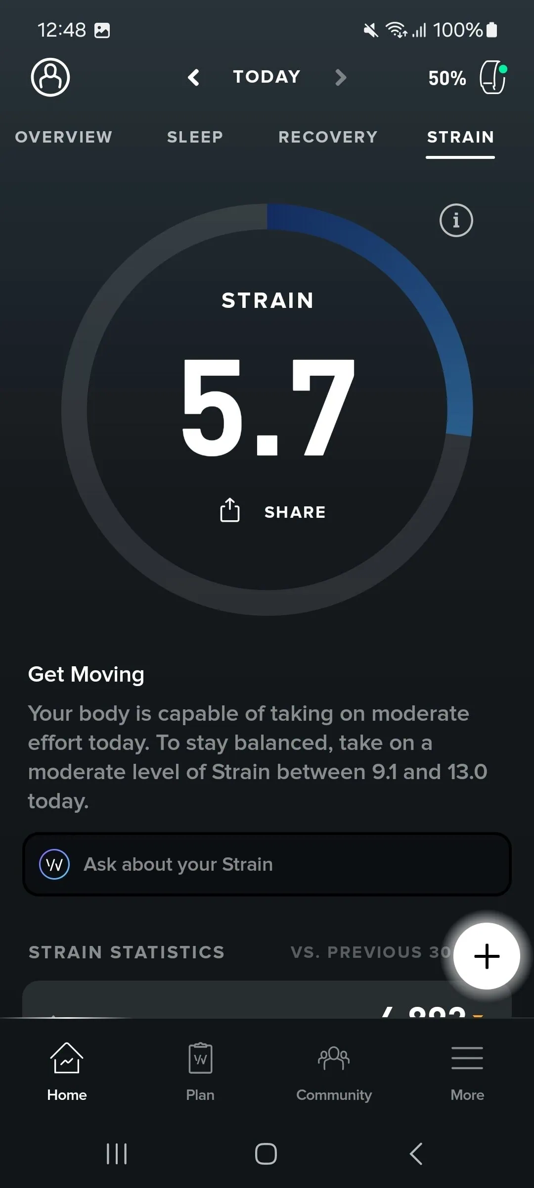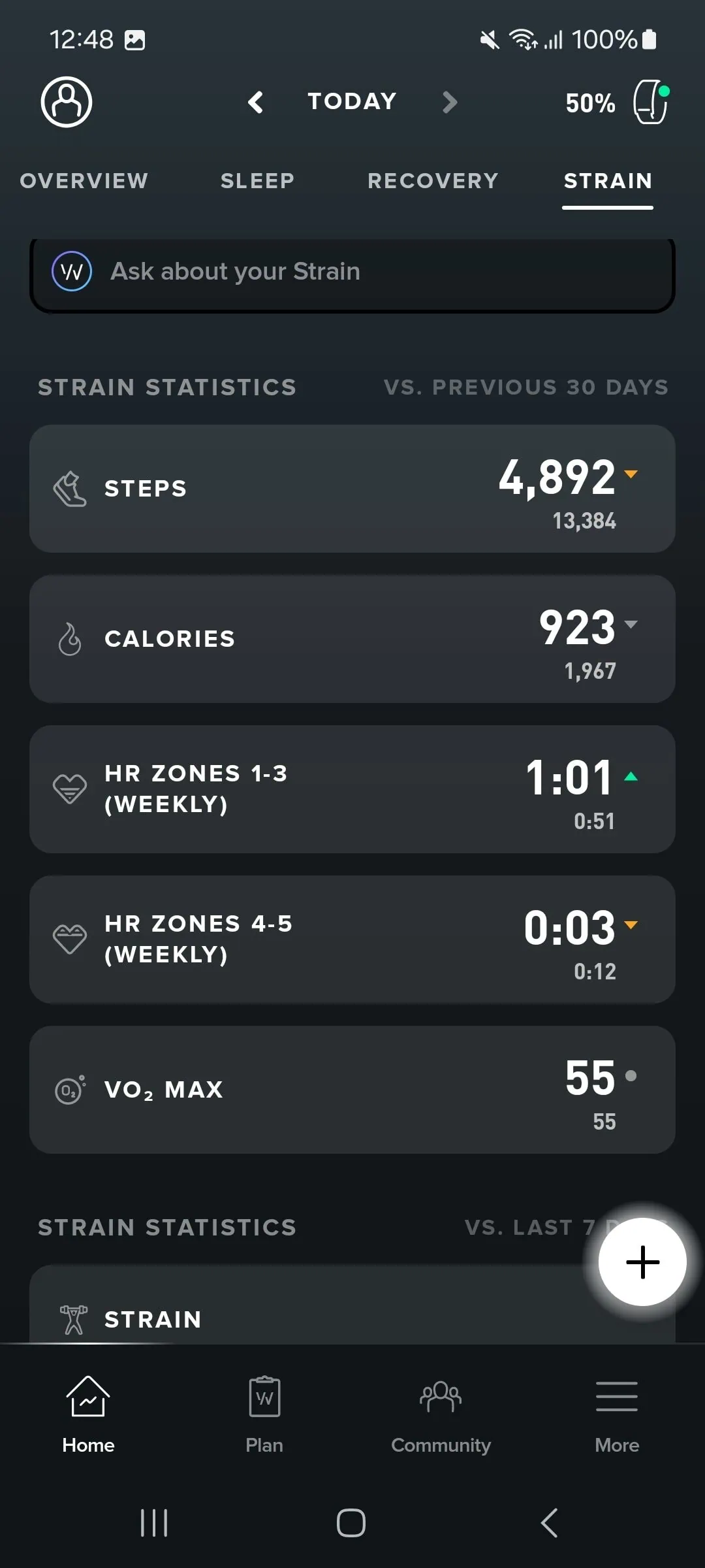 Metrika Strain odzwierciedla obciążenie fizyczne, które wpływa na Twój stan zdrowia. Na poziom obciążenia składają się kroki, aktywnie i pasywnie spalone kalorie, minuty spędzone w różnych strefach tętna oraz Twój VO2 max. Bardzo doceniam krótki komentarz pod aktualną wartością, w którym dowiedziałem się, jak mogę zaplanować swoją aktywność sportową.